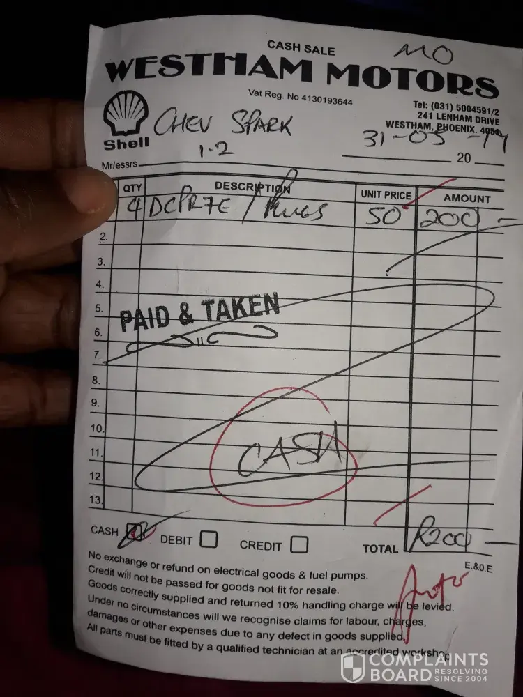 I want to complaint about CMH Opel Umhlanga. They have a poor service. On the 23/02/2019 I went to service my car it was a major services. Nothing was done in my car because all the noise I told them was still there after the services. Worse part on the 29 May while I was going to cornubia mall I saw a sign which I dont understand so i decided to went to CMH Opel Umhlanga so that the can check my car. They told me that they can test the car. After test nothing was given to me in was told that may be the Bettry was low. There have no time to give what was the reason. They told me to leave and said the said will run away. And I was told to come back and pay if sign is still there. When I left there sign was still there the car was unable to move. CMH failed to assist me and m unhappy about that. Then I decide to find michenica to assist me he put the car in the machine and gave me print out of what wrong with a car. Plugs were old because CHM OPel umhlanga never changed it when I came for services I'm very upset with their services. I had to buy new plugs which costs me a lot of money. And I have to pay a labour as well. According to CMH plugs were changed but never given to me after taken out. I miss Williams hunts where I bought my car service was good and there were normally give me what they have taken out. Even on a minor service they also rob me and they never informed me about old brakes and pad. I had to find mechanica to do it for me. I will not recomm CMH to anyone because they are taking advantage of women. I was using CMH so that my car will last longer but it is useless. I angry for what they did to me. Can I be paid back my money because nothing's was done to my car. Labour cost me R350. I will attached slips.