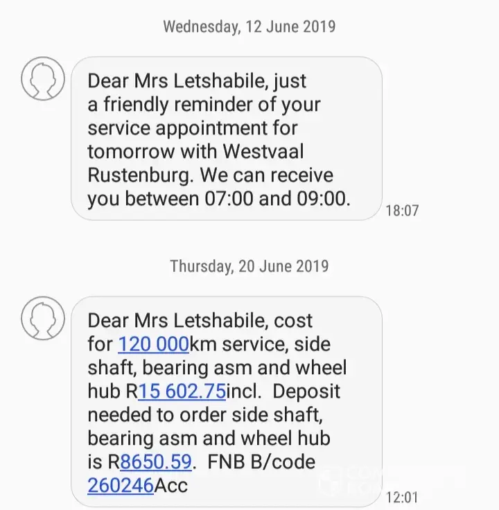 It doesn't end there, they've had my car since December 12th, needless to say, I get a call saying the battery has died since it's been standing for a month, the car was taken to Motolek to have the wiring checked, then they also replaced some hoses of some kind & it still isn't fixed. I constantly have to phone them to find out what's going on and when I can expect to get my car back. I've even resorted to driving down there to speak to them in person and was met with a poor attitude and lack of caring about my situation from the head of the workshop. In the meantime, I'm still paying my hefty car installment regardless.