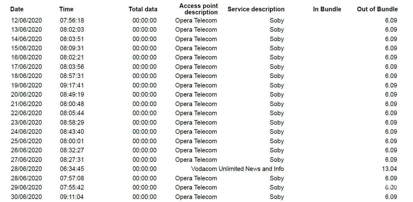 I do not have any recollection of my approval to subscribe to anything from Opera or Soby or other. They have been deducting ZAR 6.09 every day since 25/05/2020.