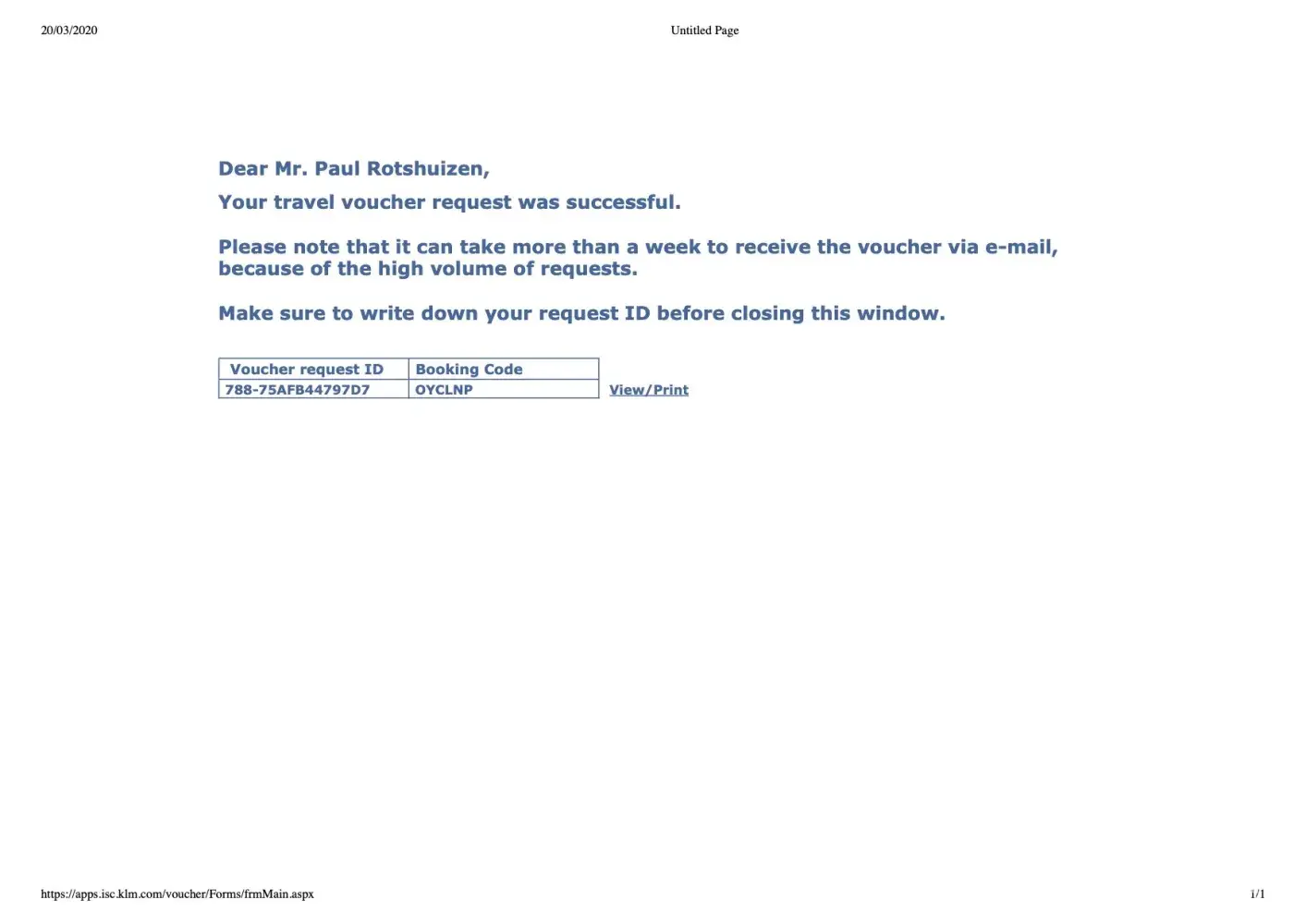 KLM sent me the KLM Voucher Request ID: 788-75AFB44797D7 for ref OYCLNP. I have a copy of this KLM document (attached)