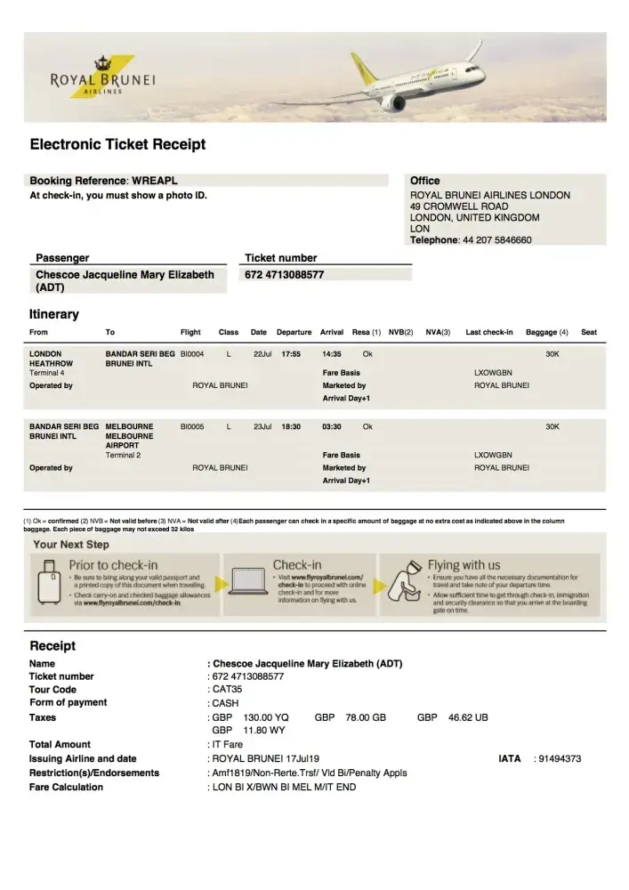 22/23 July 2019 London Heathrow, via Brunei to Melbourne