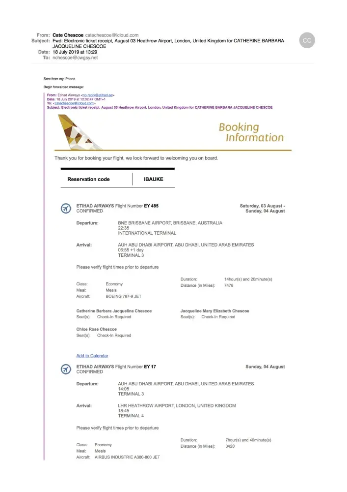 3/4 August 2019 Brisbane, via Abu Dhabi to London Heathrow