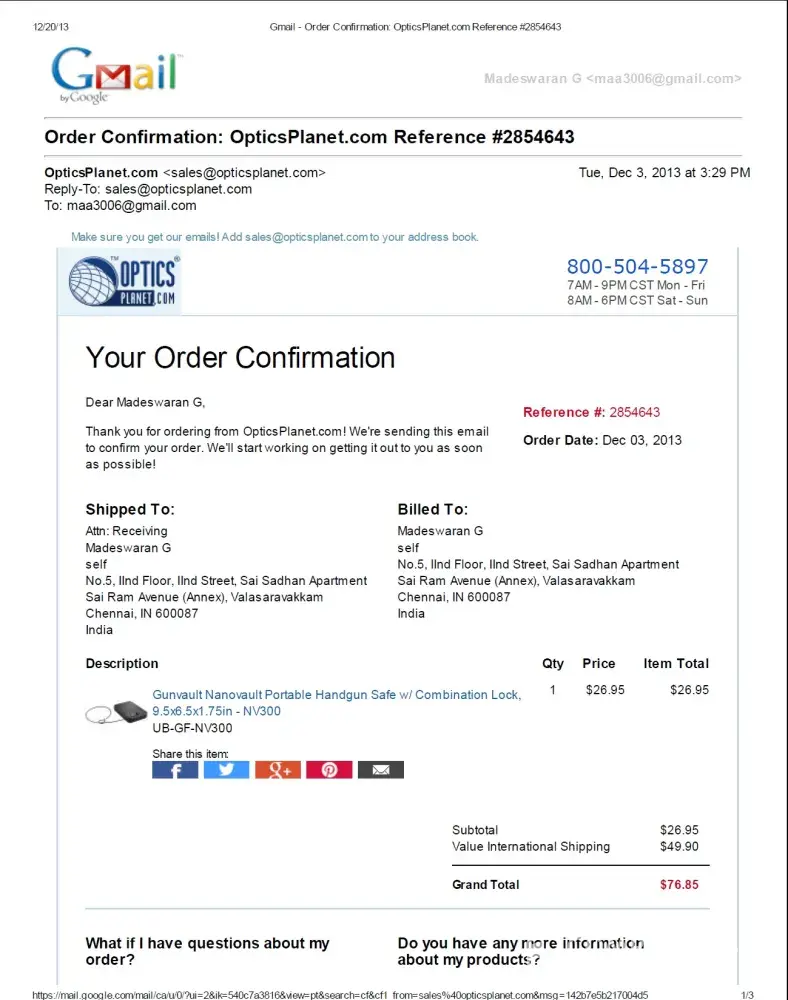 I placed an order on Dec 03, 2013 for a Gunvault nanovault portable handgun safe NV300 from Optics Planet (www.opticsplanet.com) that was on sale for $26.95+shipping charges 49.90 and normally around $76.85 order no. 2854643 on 03-12-2013
