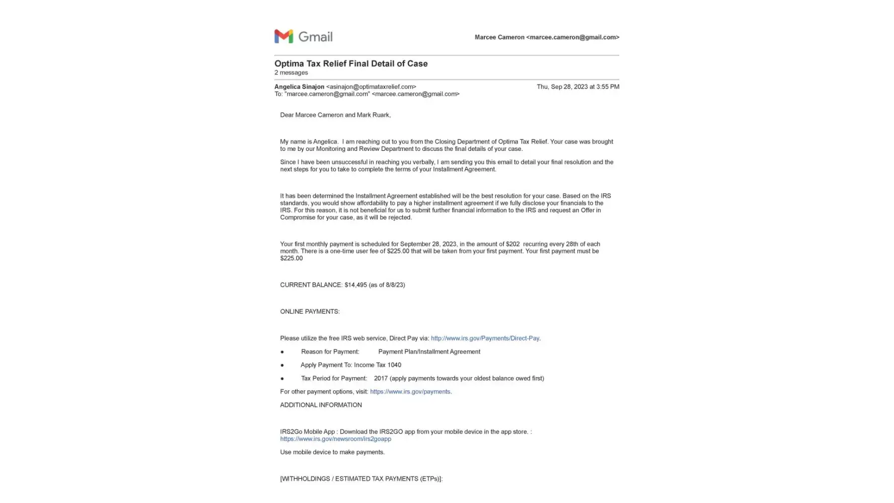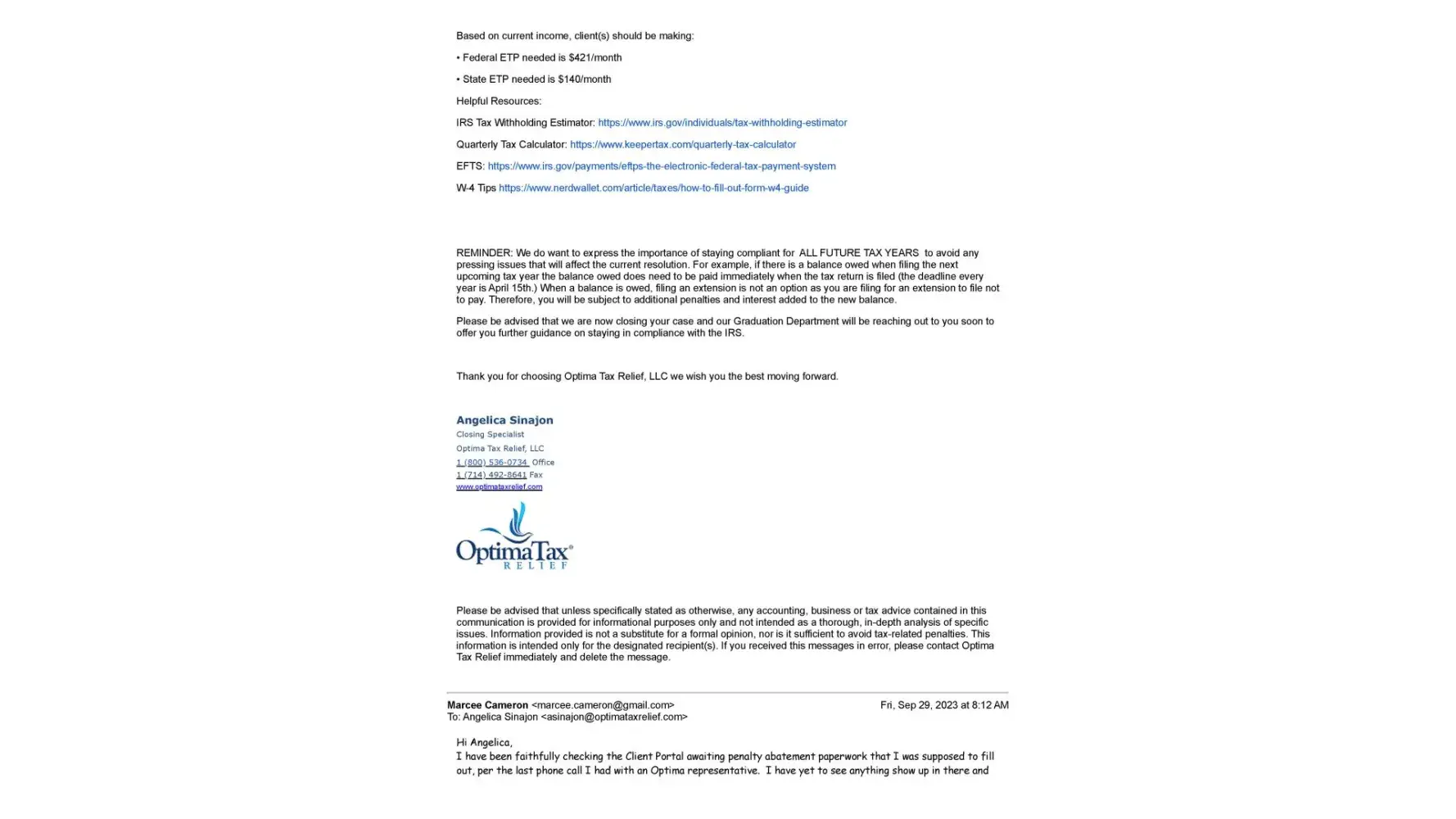 On 9/28/23 I received an email from Angelica Sinajon, Closing Department Customer Service rep at Optima, informing me that my case was being closed due to her being "unsuccessful in reaching you verbally." This is my second encounter with Ms. Sinajon - the first was when she called me at work, despite my REPEATED REQUESTS TO NOT BE CONTACTED AT WORK BECAUSE MY JOB REQUIRES ME TO ANSWER THE PHONE. Before Optima took thousands of dollars from me to negotiate my case with the IRS, they were able to call me in the evenings. Once they had my money in hand, the only hours they were available to discuss my case were 8-5, Mon-Fri. During that first call, Ms. Sinajon assured me that the call would take 5 minutes at the most, then proceeded to reduce me to tears by telling me that the IRS determined how much I could pay them before I ever came to Optima and I had to agree to make the monthly payments or Optima would not be able to begin "negotiations." I have spoken with kinder collection agents. That conversation took place in January or February of 2023, so about 6 months after I gave you my money. I was stunned. Why did I compile $175K worth of medical bills if the IRS was going to base my payment on last years W2? Instead, I incurred 6 months worth of penalties. My case with Optima has been dragging along for more than a year. My last conversation with anyone from Optima was a month or two ago and I agreed to the payments and was told I would be sent paperwork to request penalty relier. The guy I spoke with at that time didn't know anything about any negotiations. I have been watching my client portal for the penalty relief paperwork and have seen nothing, so Ms. Sinajon's email today informing me that my case is being dropped for lack of communication is a shock. I've been waiting over a year to find out that Optima hasn't even spoken to the IRS on my behalf, a fact which is made clear in the email Ms. Sinajon sent yesterday.