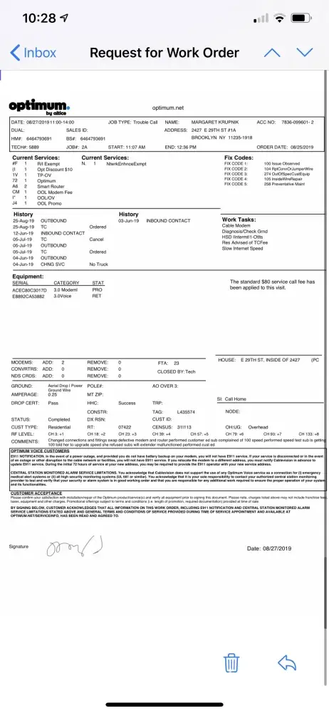 i have had little or no internet and wifi over the last month spoke with reps on phone from optimumat least 8 hrs total over last month made me pick up new router then new moden tried to download wifi and internet from main office at least 6 times in last 4 wks from main office finally sent tech to building i live in.apptmt set at 11am.tech called me at 1030 said he already arrived and found problem outside my apartmentin junction box where only technicians have acess a crimped wire came inside to see if i had service and left Optimum is trying to charge me $80 for call saying tech reported doing wire work inside my apt NOT TRUE A LIE spoke to reps will not credit me, Ihave been a loyal Cablevision customer for 35 years never before an issue this new company is no longer providing service located overseas and is defiling the american way, I will not payI also own a house with full service Optimum$ 225.amonth will remove all services ASSENZIO [protected] [protected]@gmail.com