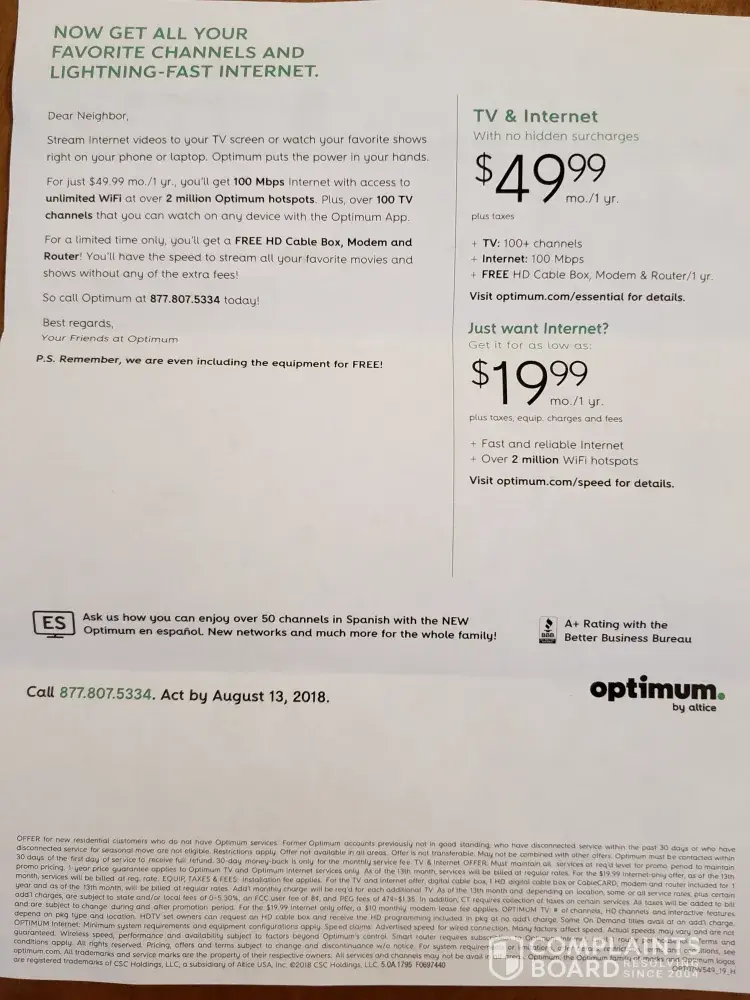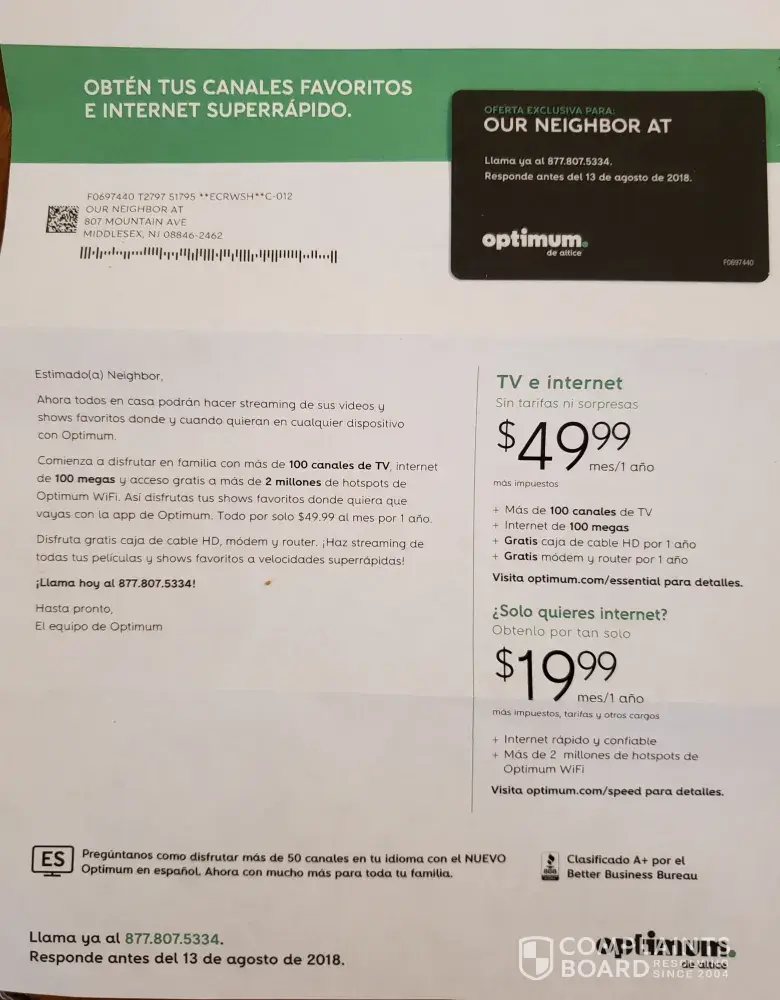 Every single envelope is sent with only Spanish written on it. I open the envelope, everything is Spanish until you flip the page over and there's one paragraph in English. This is unacceptable in america. It's understood that we have all diversities, but the main language is English and i find it offensive that's it's assumed we all speak Spanish. Because of this, and other customer complaints about optimum, that i will never be a customer.