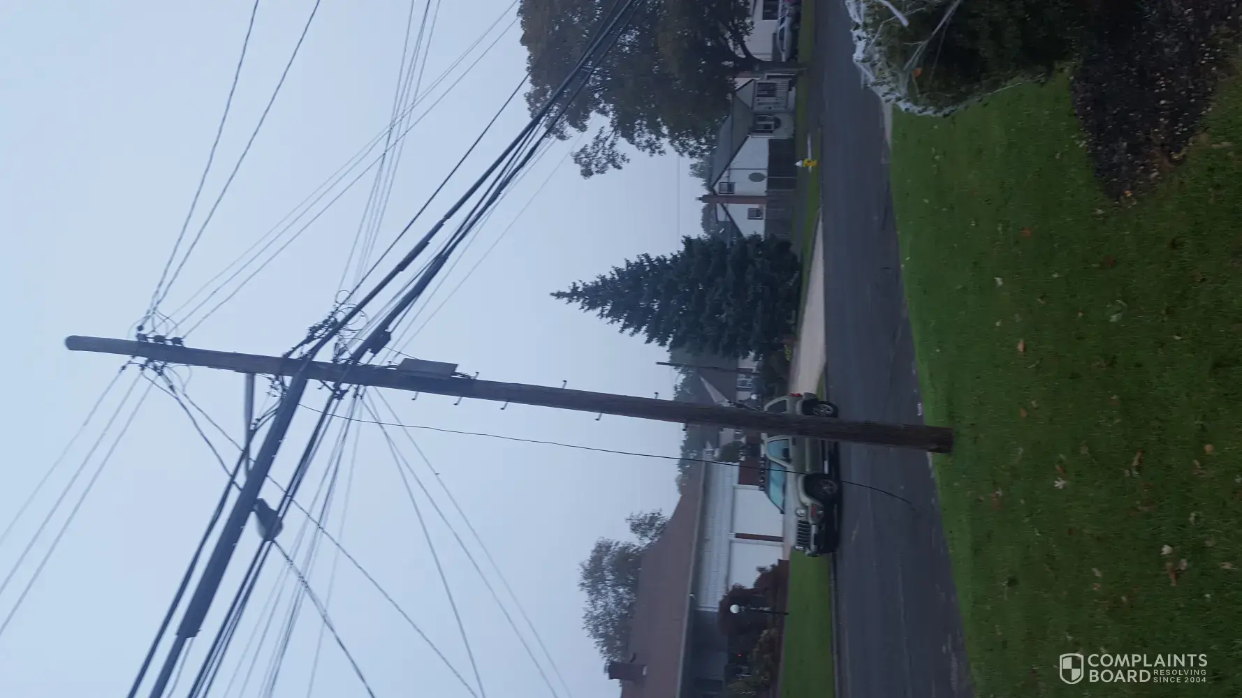 wire left hanging from pole on front lawn