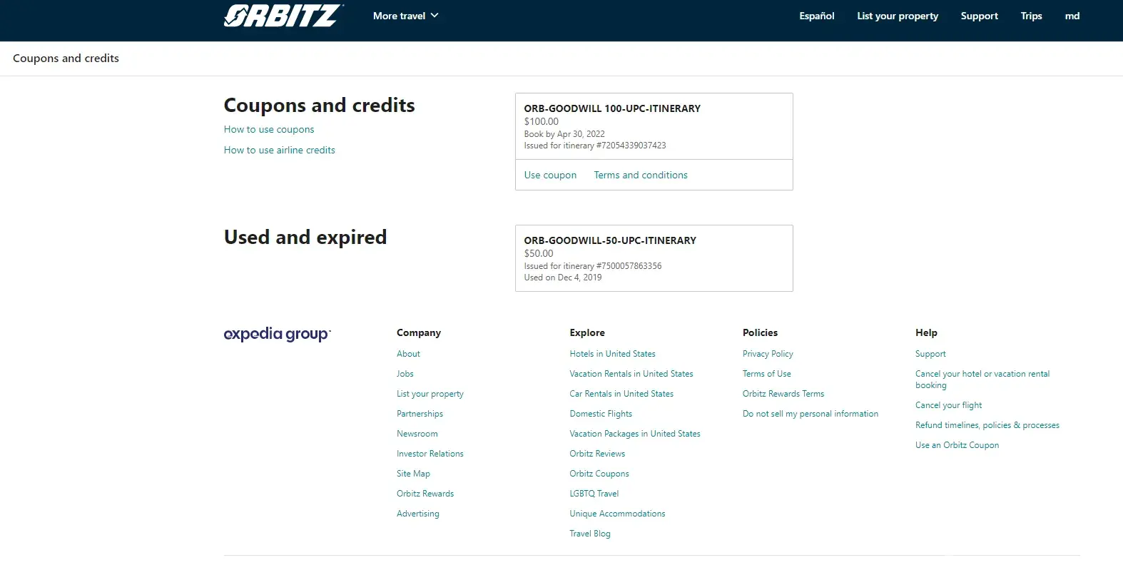 Orb-goodwill 100-upc-itinerary coupon (not expired) not been availave to use