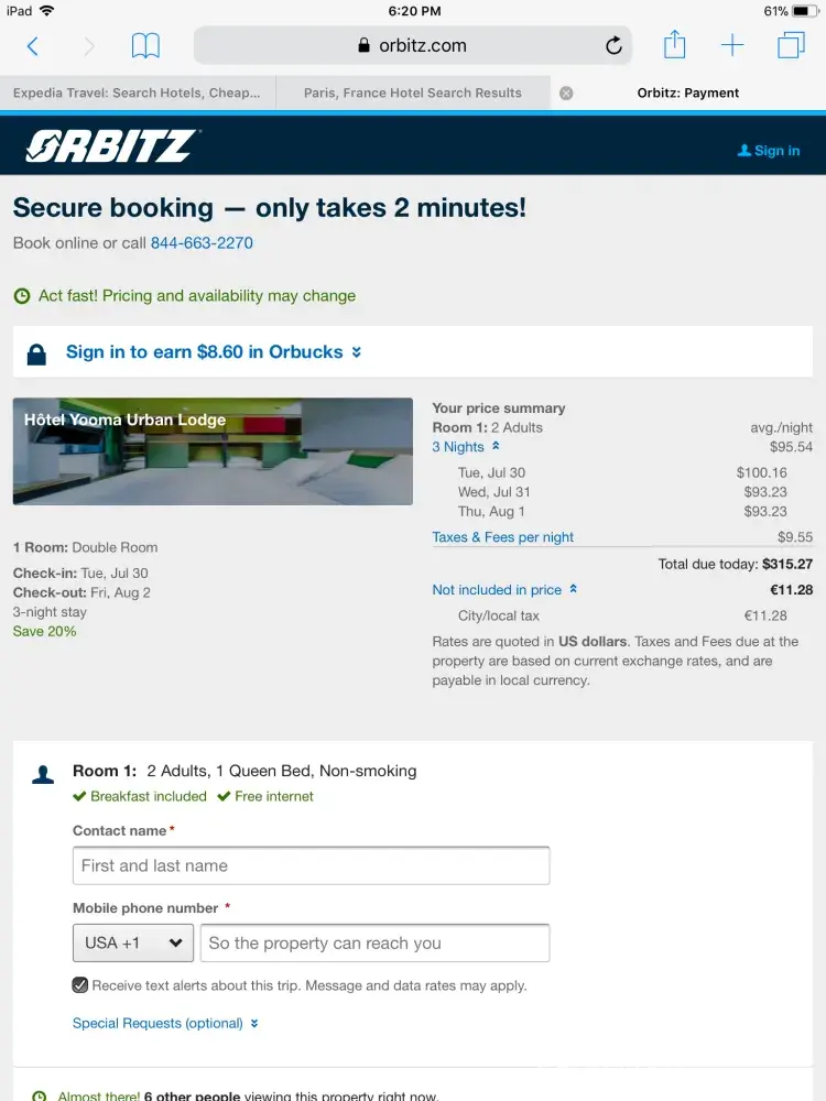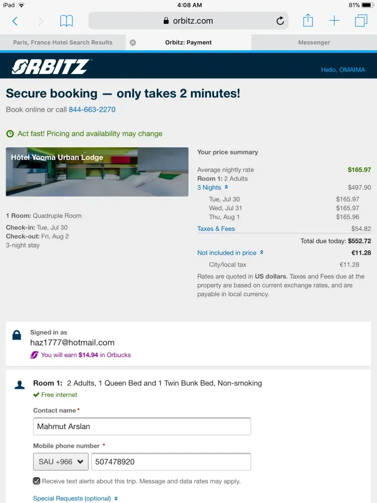 Pathetic. Rip off. Go directly through the hotel or airline or use someone else. Orbitz is a well known name, but just another scamming company willing to rip you off and not work with you at all. This was the worst booking experience I've EVER had.