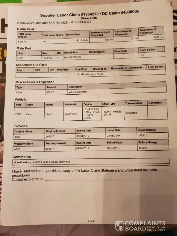 Three months later in July the R & P started leaking really bad again. I went to O'Reilly in Shorewood, IL #4838 and talked to Domingo. He said to take it back to Shorewood Lube for another replacement and they would warranty the R & P and labor . So on 7/24/19 (mileage 195, 669) I did that. Domingo told me that it would take some time and I would go to Shorewood Lube this time to get a check for the labor. I paid $408.67 for the labor. This was no fault of my own that 2 Rack & Pinions break within 4 months. I also had also tried calling Joey Kraska on 9/24/19 and Ken Hubbart (both at the corporate office) and no calls have been returned. I left multiple messages with both. I have waited long enough and would like my reimbursement for my second labor warranty ASAP. Thank you for your attention.