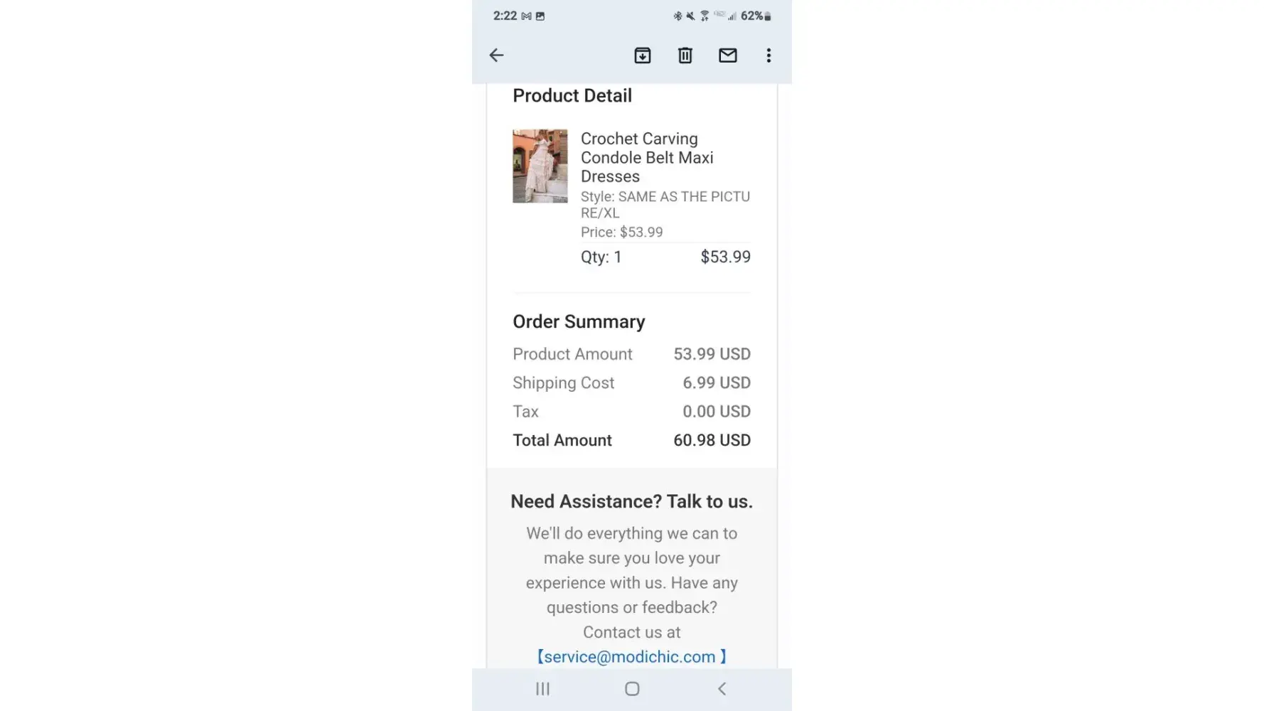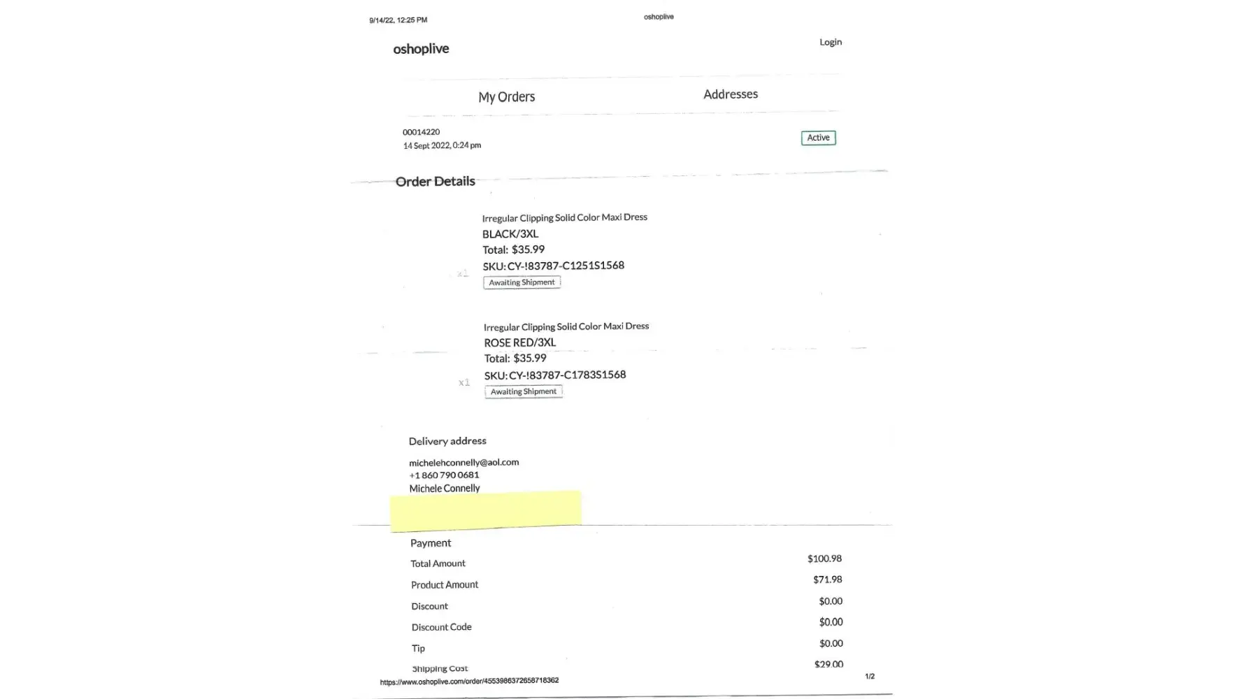 I purchased this yellow, size 2X dress on May 27, 202 at 6:30 pm. Weeks went by and I reached out to OShopLive by email. There were two email addresses available for the company. Both were not in service or could not be delivered to.