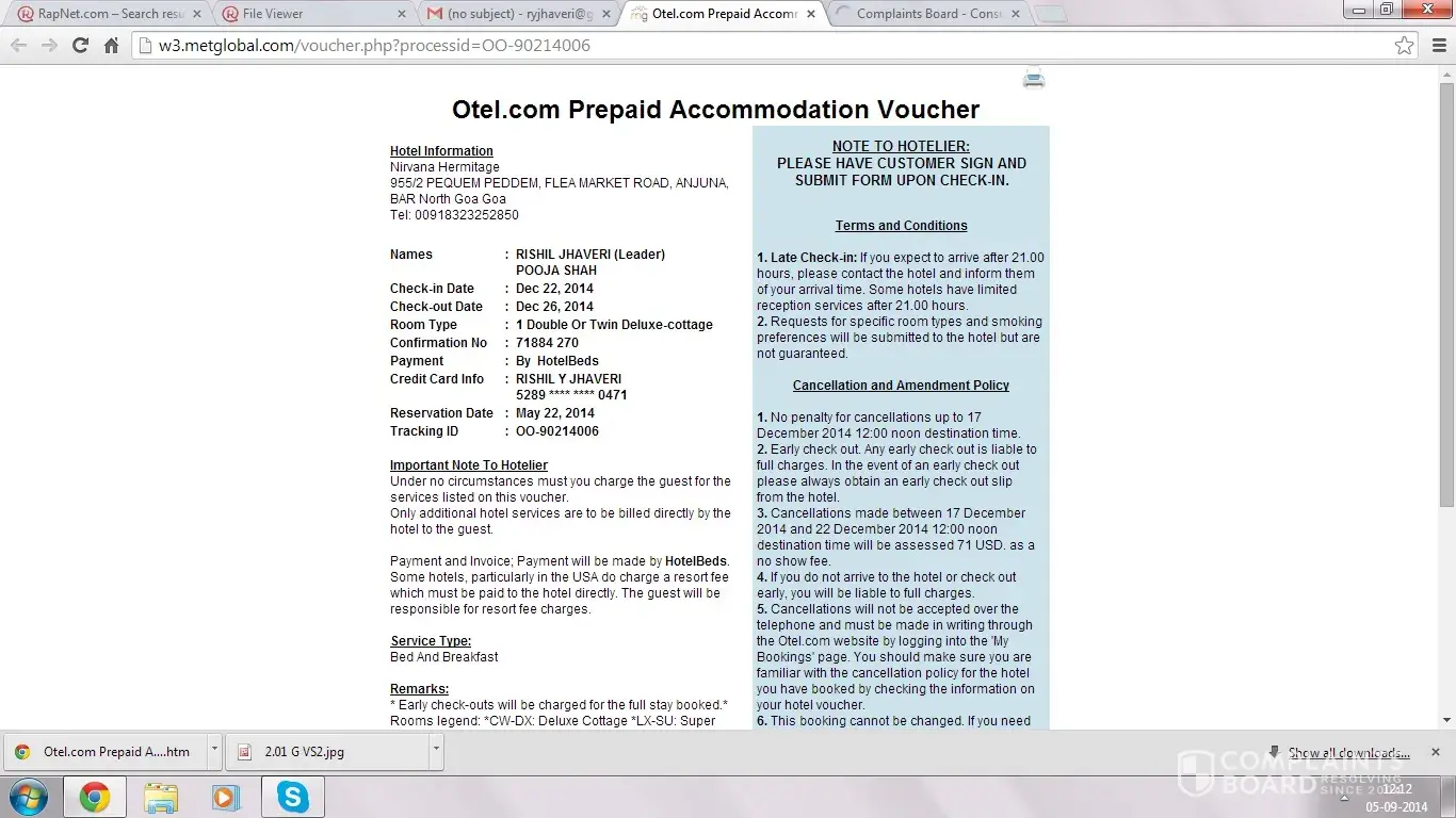 I booked a hotel using Otel.com. At first glance, everything seamed to be fine. The charged my Debit Card and emailed a booking confirmation as well as my reservation voucher.