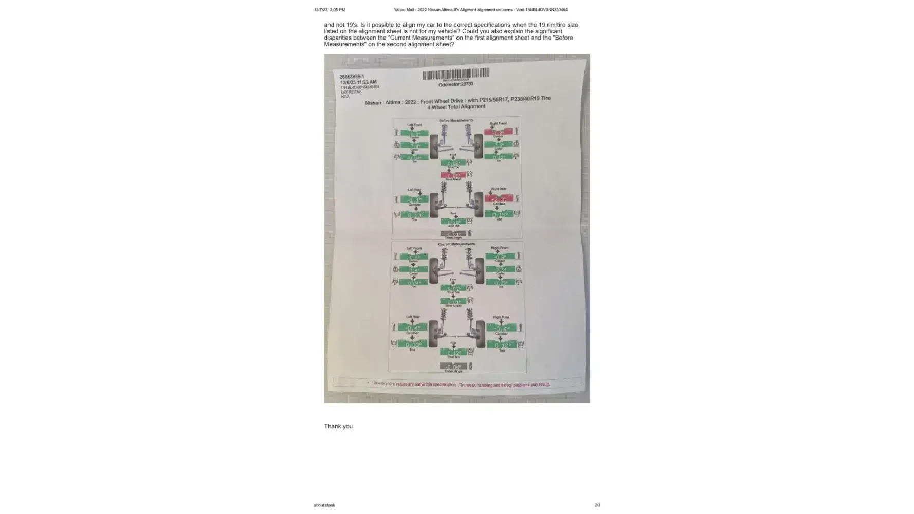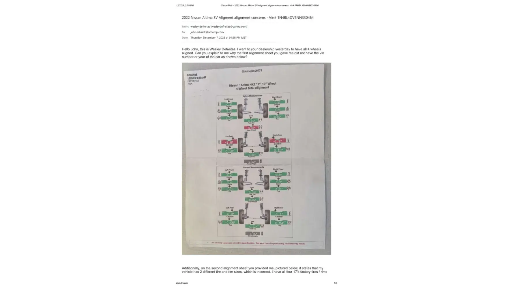 Nissan of North America refuses to provide me with a solution regarding my vehicle misalignment. I have taken my vehicle to the Nissan dealer more than 3 times to have the alignment issue resolved. My vehicle still under Nissan factory warranty. Misalignment can put undue stress on a vehicle’s suspension. This poses a risk of damaging suspension...
