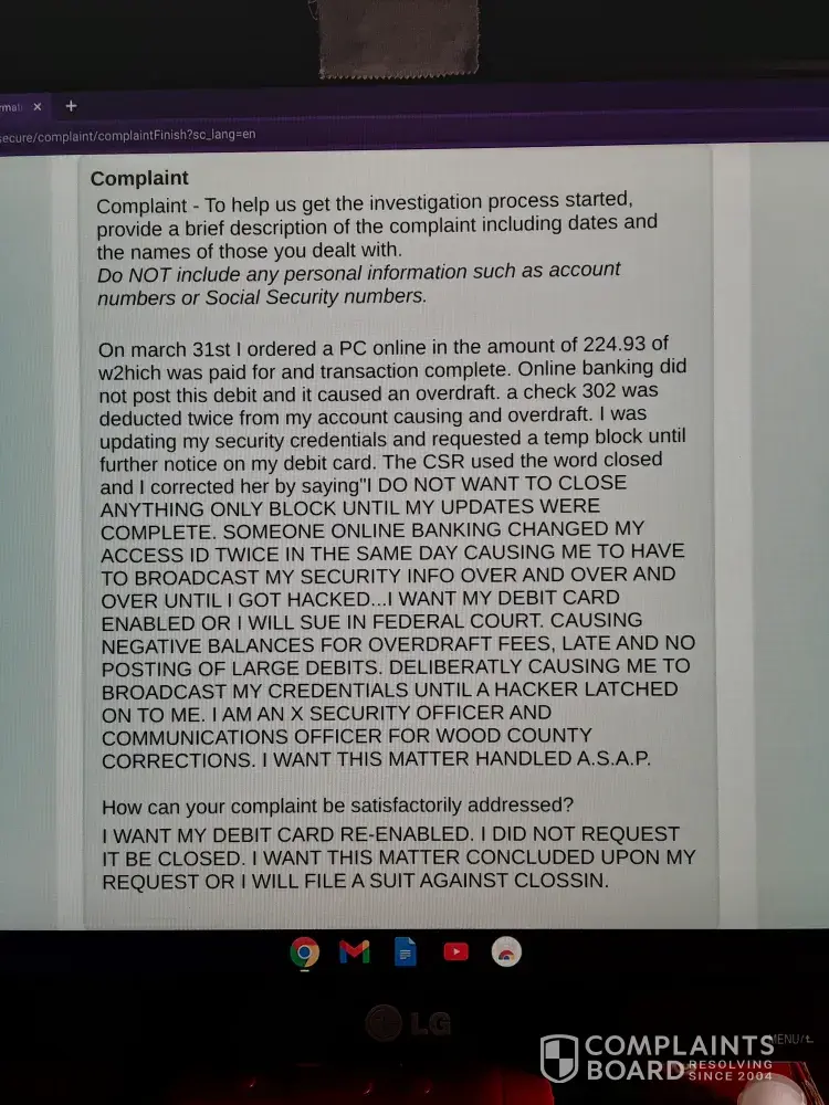 This will be the 6th or 7th complaint filed against this bank stealing my money, not keeping accurate records and being terroristic in their practices toward me. I must be real special for this bank to feel the need to retaliate in the manner of which it has chosen. Their final act of defiance against me was creating one last overdraft fee from a 38$...