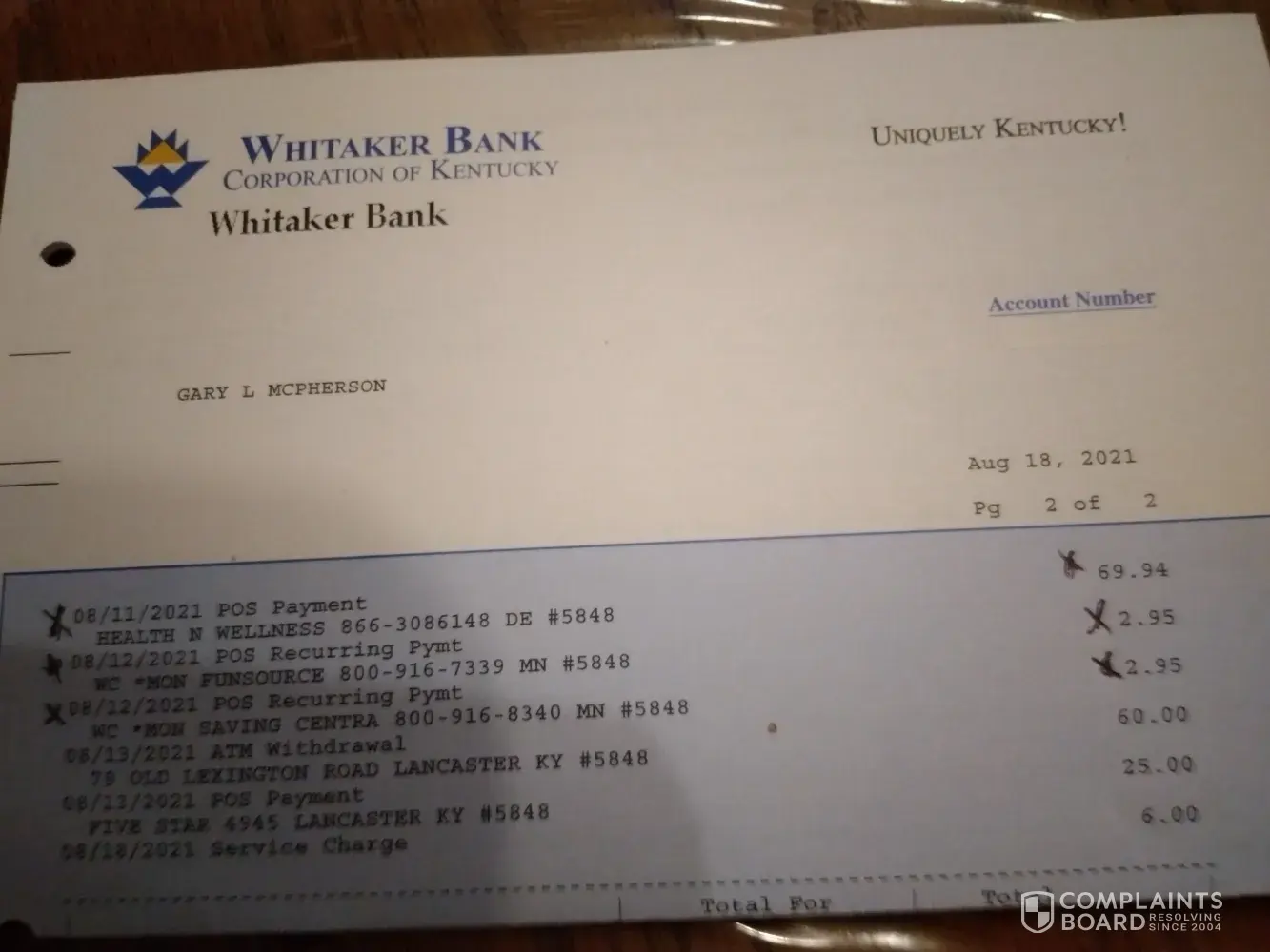 Hello, This is Gary L McPherson Lancaster Kentucky As of August 2020 through September 03, 2021 their has been charges applied to my debit visa card. The name of this company is WC MON Saving Central in Minneapolis. The telephone number that my Whitaker Bank statement my (local bank) has printed on my bank statement is [protected] and [protected] for...