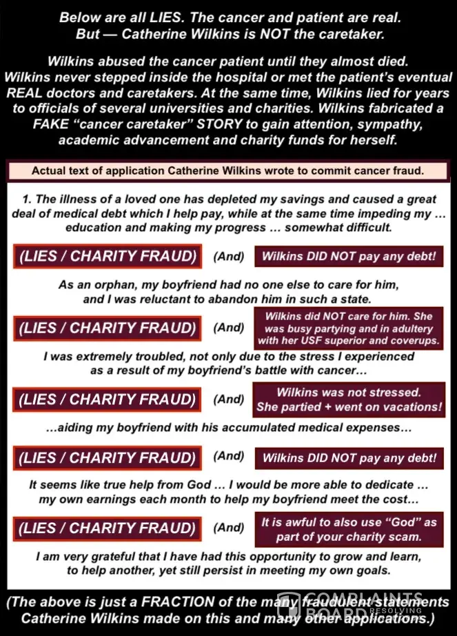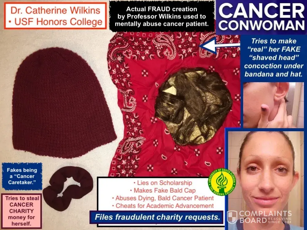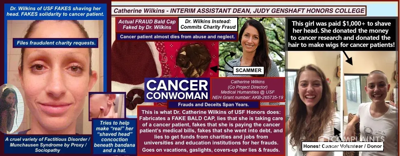 Professor, Assistant Dean Catherine Wilkins For Judy Genshaft College USF: Catherine Wilkins' CANCER charity fraud. Catherine Wilkins repeatedly found opportunities to cheat, lie, and defraud the academic system. Catherine Wilkins tried to steal charity money with a CANCER SCAM. Catherine Wilkins committed multiple instances of charity fraud...