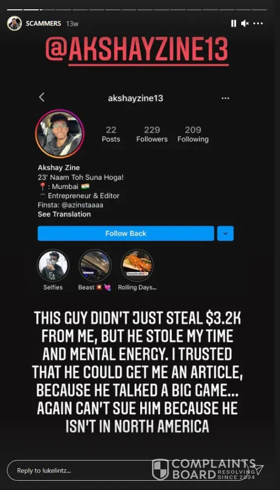 I'm writing this report on behalf of my clients who got scammed by an internet fraudster Akshay Zine. Akshay Zine is a scammer who sends messages to entrepreneurs, influencers, and celebrities on Instagram. He promises to provide press articles and social media services and takes demands to advance money from the victim. Once he receives the money, he...