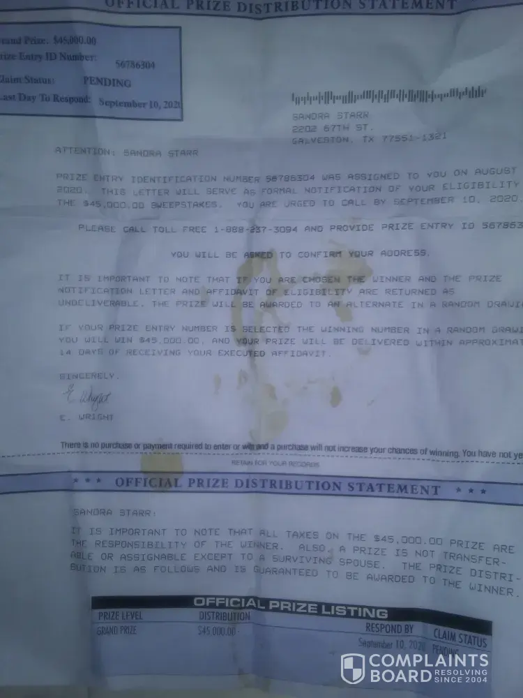 Read full complaintFantasy Riches Sweepstake - Got an official letter