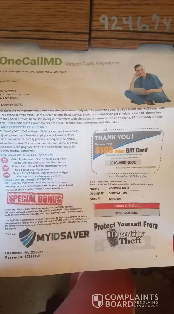 Read full complaintOnecallmd - Fake gift card and can not get in touch with anyone to cancel my services