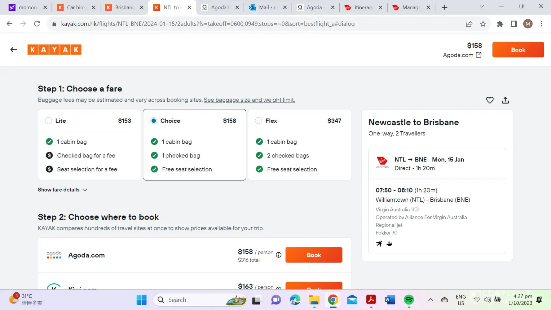 Kayak advertised that Agoda sold a CHOICE ticket (including luggage) on Virgin Australia from Newcastle to Brisbane. Agoda subsequently issued a LITE ticket (no luggage) and claims they do not sell anything but LITE tickets. Date of travel 15 Jan 2024. Correspondence with Kayak and Agoda were not satisfactory - both disclaimed liability. Kayak said they...