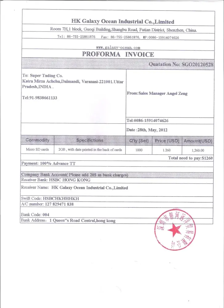 Shenzhen Galaxy Ocean Trading Co., Ltd is a fraud and cheater company. HK Galaxy Ocean Industrial Co. Limited is the business account name of this company. Bank account details and address of this fraud company. Bank name -HSBC HONG KONG Bank account name -HK Galaxy Ocean Industrial Co. Limited Swift code - HSBCHKHHHKH A/C no. - [protected] Bank...