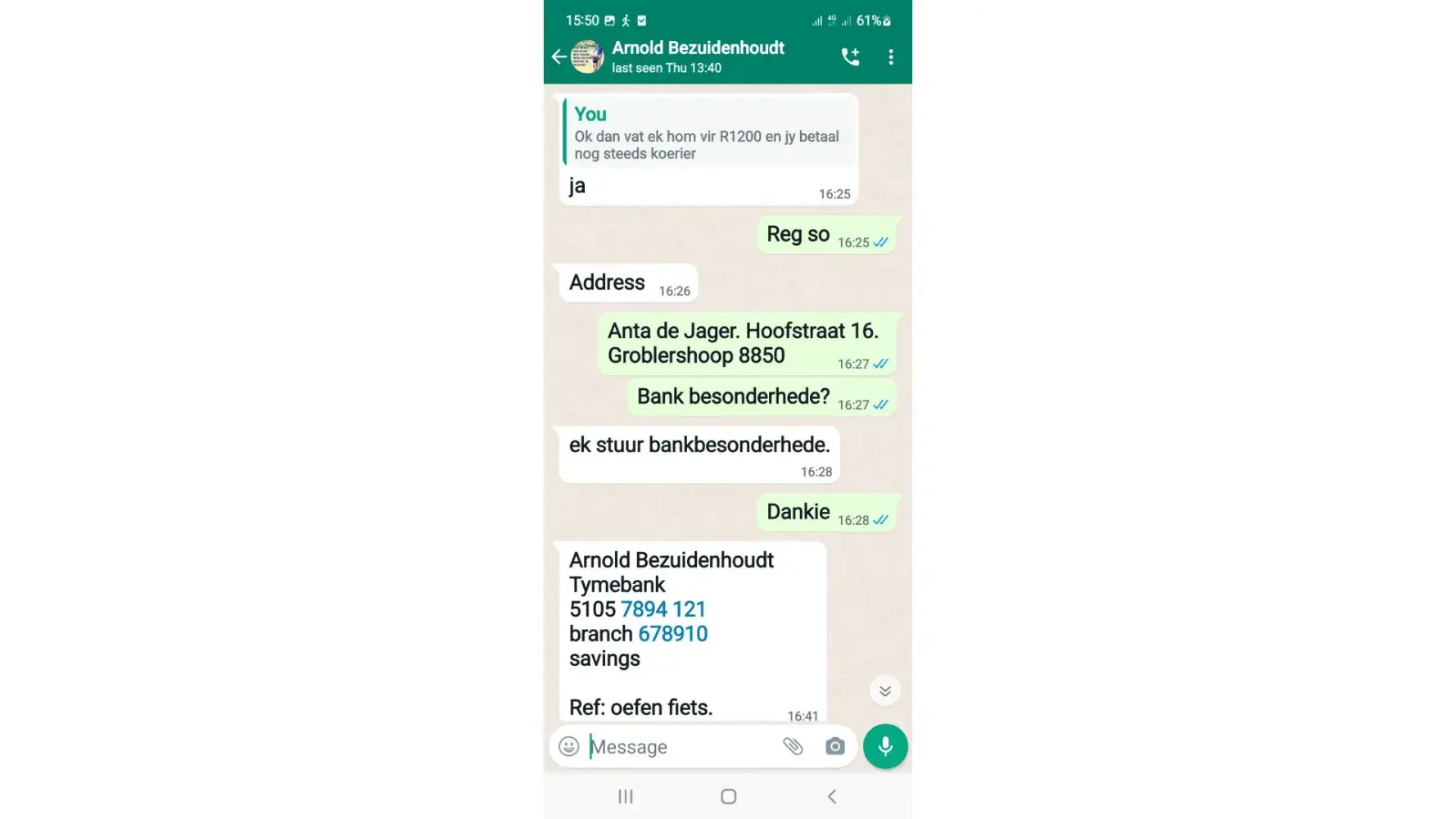 I bought a Trojan exercise bike (and paid - R1200) from Arnold Bezuidenhout of Kathu. He operates a transportation services throughout the North Cape. Also known under the name "Arrie". He banks at Tymebank, Branch no.: 678910. Savings account no.: [protected]. However, I never received the Trojan exercise bike. I have proof of everything. So it cannot be denied in any way. Be careful of this thief.