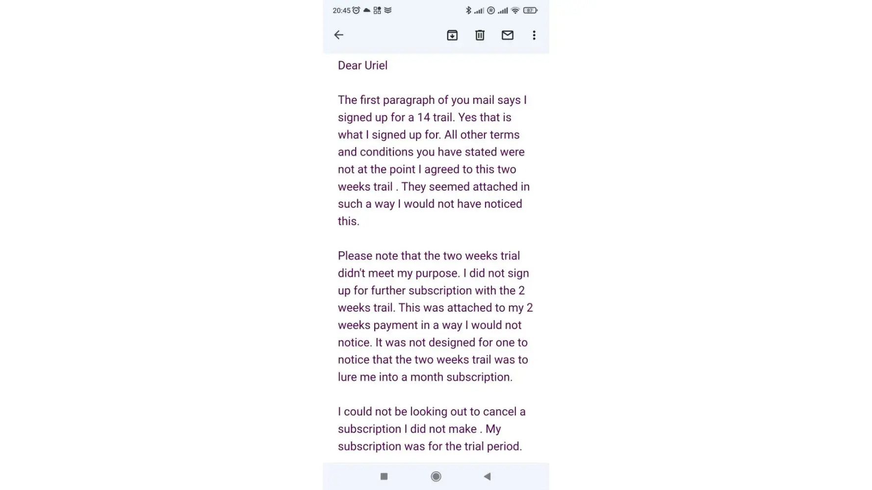 I signed up for 2Â weeks trial period, for which I paid 2.99 euro. I did not realize that the two weeks trial would lead to a full subscription. The advert for the trial period did not make the compulsory subscription obvious. When I entered for the trial, I did not realize I had to terminate this entry and also terminate the following monthly subscription...