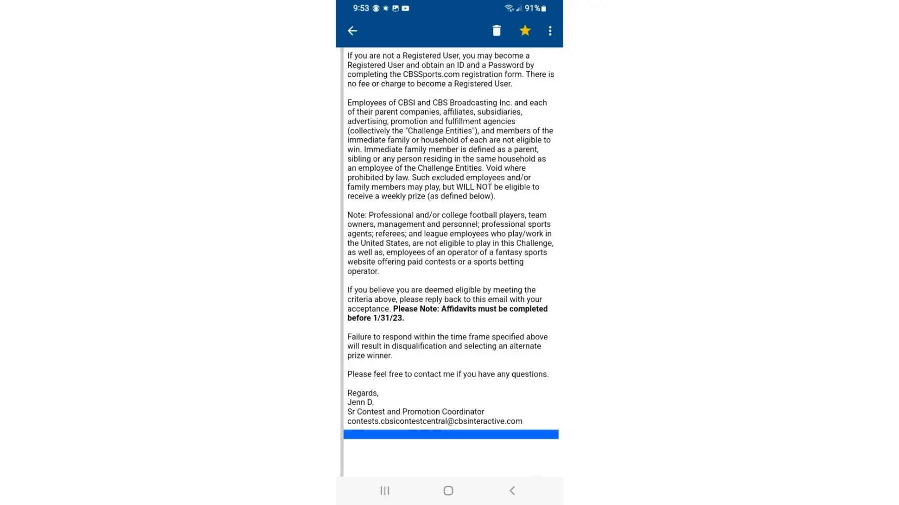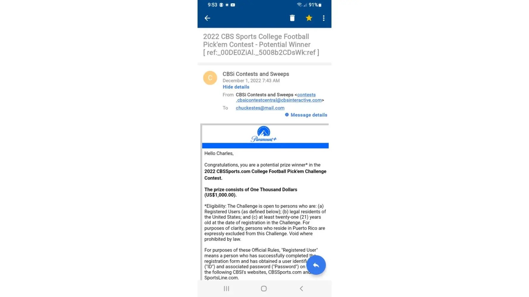 On 12/1/22 I received an email from CBS Sports Interactive informing me that I was a potential winner in their online college football picking contest. I immediately replied that same date indicating, as requested, that I was eligible and I did wish to accept the indicated prize money. I have never received a response. On 12/6/22 I received the exact same...