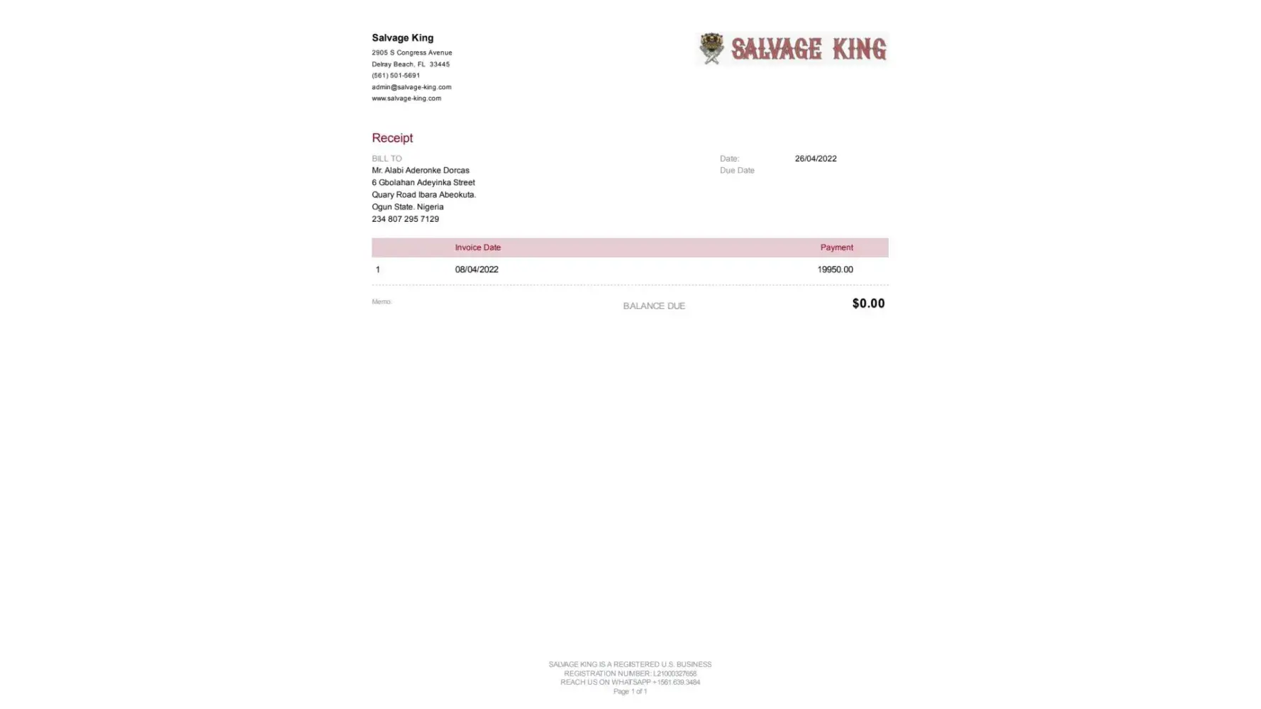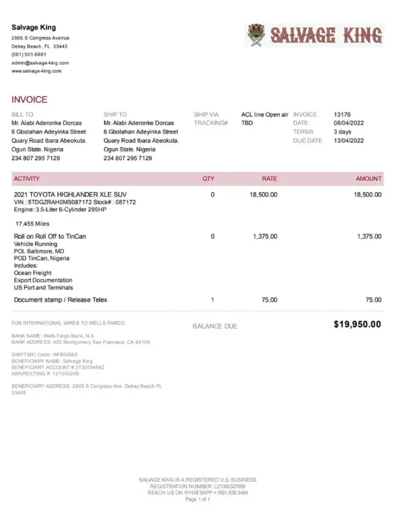 I paid for a Toyota highlander 2021 model VIN: 5TDGZRAH0MS087172 stock# 087172 advertised by salvage King on www.salvage-king.com in April 2022. Payment transfered completely. Salvage King issued invoice and receipt to me and promised to ship the SUV to me in 2 weeks. Salvage King never shipped the SUV to me since then. Salvage King has never respond to...