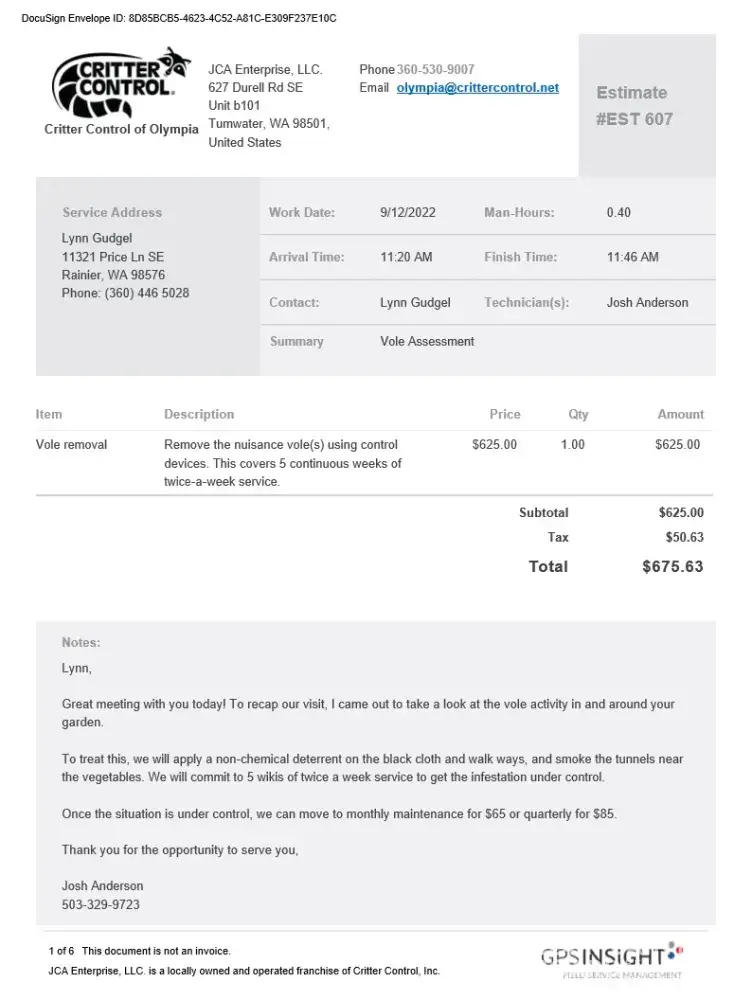 Read full complaintCritter Control of Olympia JCA Enterprise LLC - Removal of voles in and around my garden