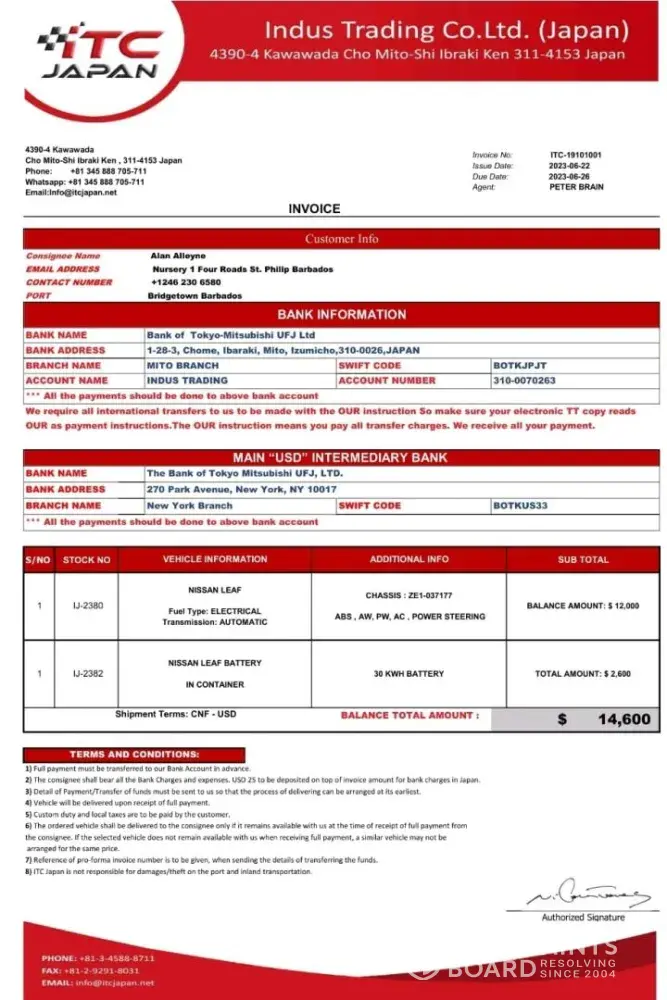 Read full complaintITC Indus Trading Japan - ev battery/used car