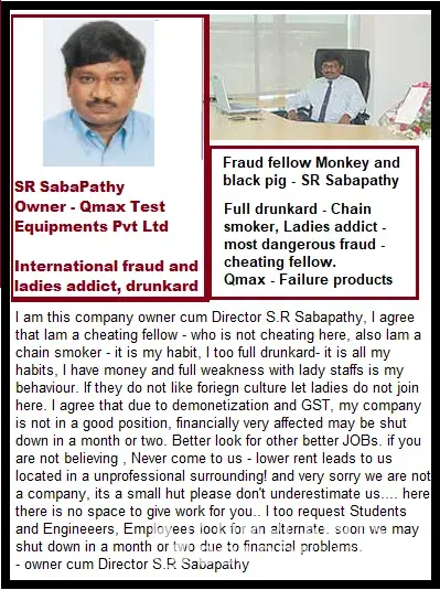 SR Sabapathy is an International Fraud Selling Failure and Fake Products Qmax Test Equipments Pvt Ltd Reviews & Complaints: QmaxTest.com, SR Sabapathy is an International Fraud Selling Failure and Fake Products Comments from Rupiya Rupi Rupiya Rupi ladies don't enter in to this fellow sabapathy room, beaten him with my slipper (seruppu) after he...