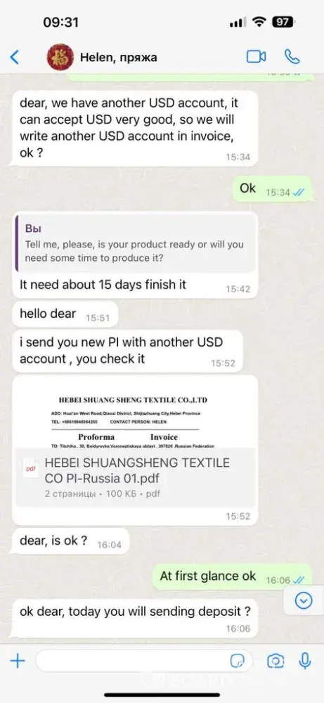 A scammer is trading on your site. a year ago, it was this person who negotiated with us on behalf of another company and stole money from us. On July 19, 2022, an international contract was concluded for the supply of goods - recycled yarn with Hebei Shuangsheng Textile Co., Ltd, whose director is Wei Wei Zhang, in the amount of RMB 246,291 On July 28...