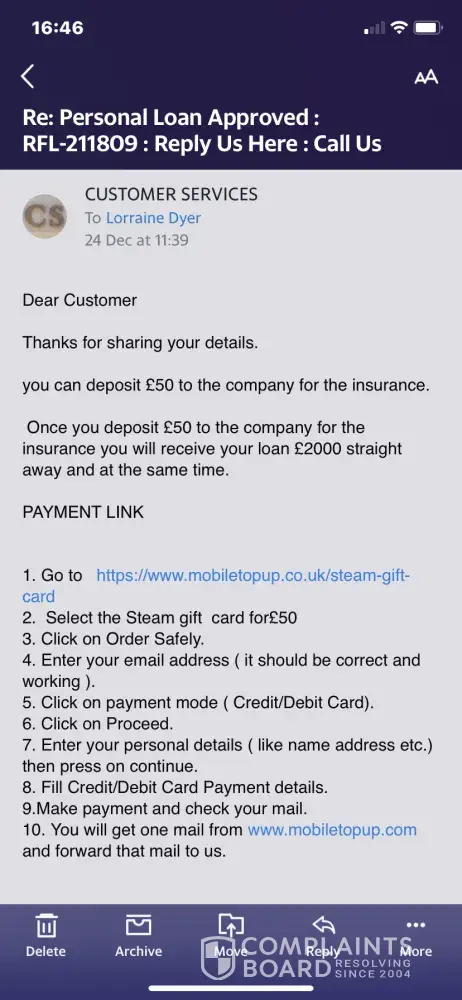 Please do not been taken in by this scam. They ask for a £50 steam card to be sent to cover administrative fees. Once they have got that they start asking for £100 to cover the charges for a CHAPS payment. It's a complete scam. They are targeting people with poor credit ratings. They can't be able to get away with this. I'm now £50 out of pocket and have...