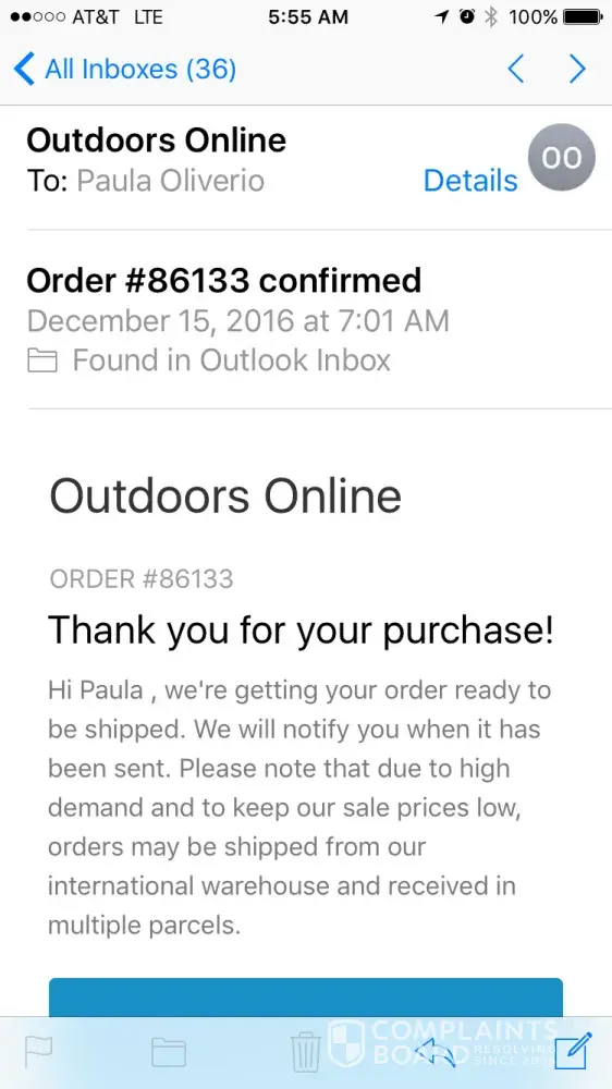 At this point I am assuming the outdoor online company who sold it to me that is their name I took screenshots from the beginning of my purchase to the end of my purchase as evidence as well as my bank statement showing I used my debit card which I have not been refunded for either and I can show that as well. If I do not receive my product or a refund in the next seven days I will be filing my own lawsuit as I see by doing a Google search other people have filed a group lawsuit and said that this was a scam which I will be joining that as well but I will be reporting this to my bank to refund the money, to the police for petty theft, which then with the screenshots, documented emails, documented recorded phone calls on my end, and the banks statement as well as the police report taking this to court for my money and for damages as well as interest and time, along with pain and suffering add it in because I am fully disabled and having to take this to court is a huge inconvenience for me having to actually get out of bed have my caregiver take me to court and prepare all of this I have no problem doing that but it will be added onto the lawsuit unless my item is received in the next seven days. Are use Amazon on a daily basis and I receive some items the very next day and two days at the latest so demanding my item be sent in seven days is generous and far beyond reasonable at this point. It is no longer acceptable to have my money stolen and I've not received the product in 12 weeks. I am sure the outdoor online company doesn't want to turn a $40 order into a several thousand dollar lawsuit and small claims court were in California a lawyer or paralegal is not allowed to defend them just a clerk or staff member and they are researched before they set foot in court when the judge makes everybody go out into the hall and attempt to mediate it before going in front of the judge we research who the person is and their position with the company and if they are found to be of legal, paralegal or lawyer background the judges notified of this fraud and an immediate win for the plaintiff is awarded. Unless this company wants to have this go this far I suggest they make contact immediately by phone to [protected] my cell number of 19 years and in advance notification all calls will be recorded for legal and police reporting purposes or you can email me at [protected]@sbcglobal.net an email of 18 years or an email of 11 years at [protected]@gmail.com
