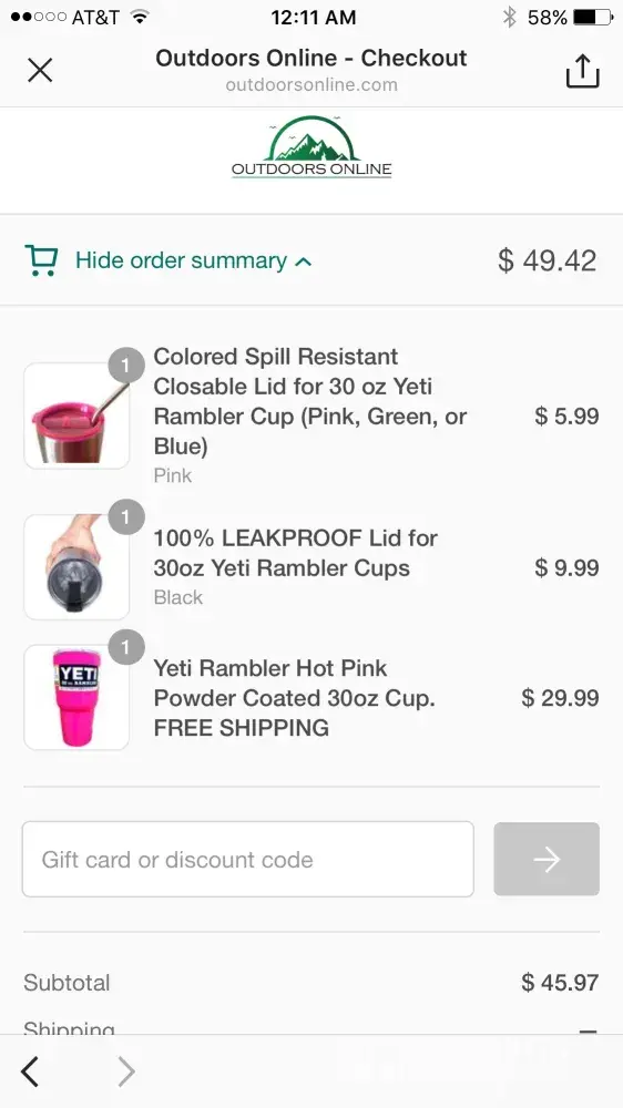 I too, was taken by the ad prior to christmas about the yeti tumblers. After paying and not receiving my order and attempting multiple times to get answers, I read several boards to discover that this seems to be the norm. Do not order from them or fishingandhikingoutlet. com or outdooroutlet. com. I spoke with a representative from yeti and they are not affiliated with any of these companies. The person I spoke with is forwarding the information to their brand protection folks. Report to the bbb and the ftc.