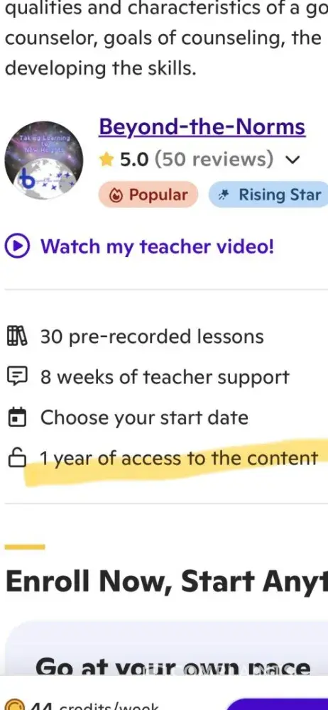 There are two self paced classes that I purchased for my daughter. The classes clearly state that there is teacher support for 8 weeks but she has access to the material for an entire year. Well, she only had access to the material for 8 weeks. The customer service member I talked to said that because the parent has access to the material via the...