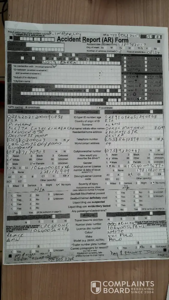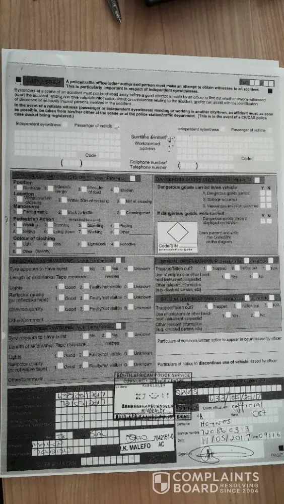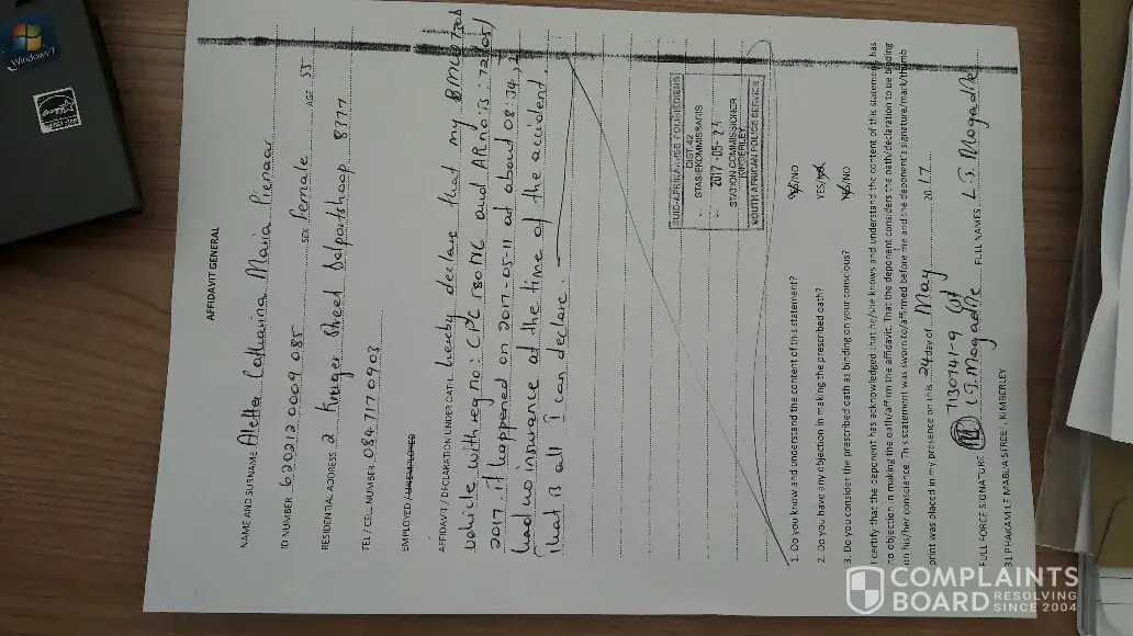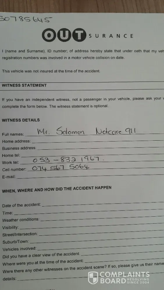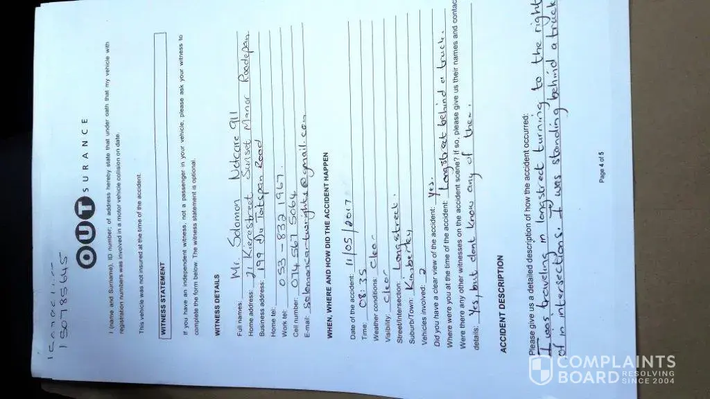 After again been told that my claim was not going to be paid out, I walked from business to business, in hope to find someone who had seen the accident took place. I found 2 men who had seen the whole accident took place. I attached these to witness reports. Lets see what Outsurance do now.