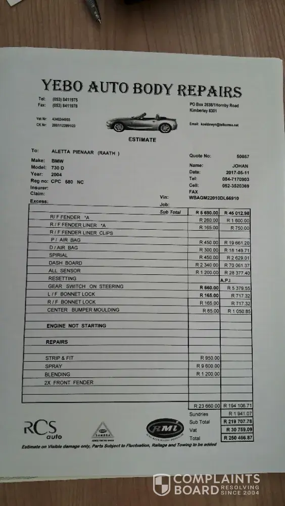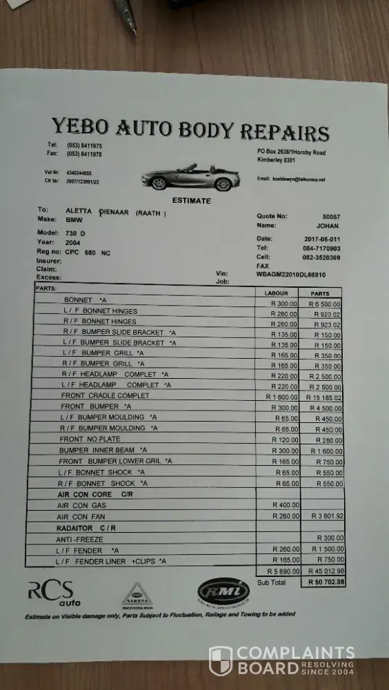 The complaints department is worse, They have only just entered the claim and the car has yet to be collected furthermore Megan when questioned on why wasn't the car tested before being released, said their assessors just look at the car they don't touch the car as that will take a long time, WELL THAT EXPLAINS WHY THE CAR is not road worthy, , furthermore the guy that gave us the car told us to drive the car slowly, Why would you drive a fixed car as if it was not .Their call centre person melvin on the day of the picking up and reporting the car not up to par, said he will see if balito panel beaters can give us a courtesy car since they didn't repair it properly, While conversing with Megan she says she's not accountable for what ppl say, You are in the complaints Dept what the hell are you there for then ? Covering up lies .More over she implies that this oil issue pressure and noise of the car is not the accidents fault, My dear we would never drive a car like that, we have children whose lives matter, we wouldn't pass this off to insurance unlike outsurance we have ethics morals and values . We have never claimed in 5 years even this accident was not our fault, We treat our car like gold as its the only one we have . You took R5630 for what ? she told me there was no engine damage, They literally just fixed the outside of the car . I work with insurance a proper assessment would have picked up impact damage . you are extorting old people who dont know there rights . Good thing their daughter does this is breaking the treating the customer tcf act
