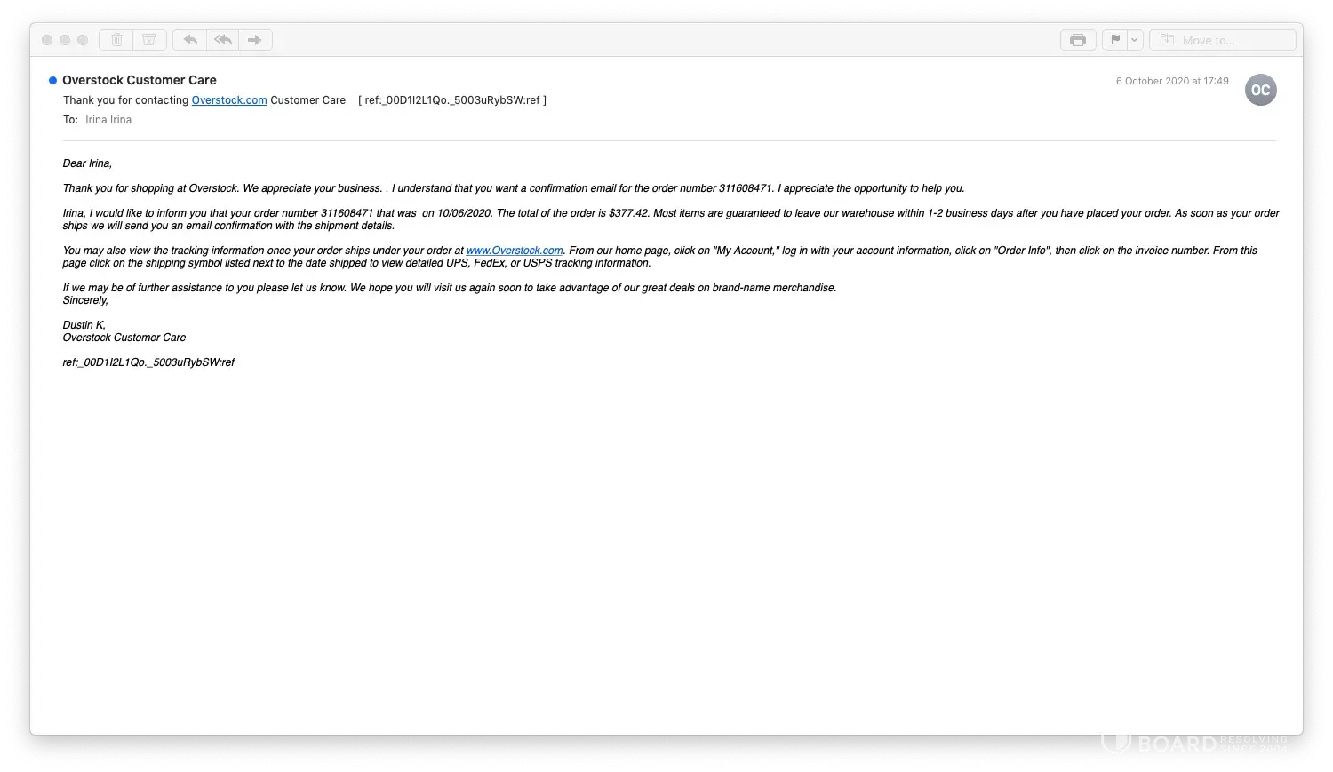 Overstock Order # 33629XXXX