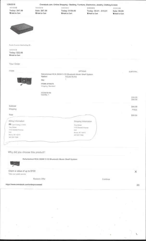 My name is Tony Bobet resided at 1710 Seward Avenue, Apt# 5-G, Bronx, New York City 10473. i am filing an complaint to Overstock.com located at 1011 N Tustin Avenue, Anahelm, CA 92807. i order an RCA stereo shelf with 5 CD player and 300 Watts. Price $99.99. i suppose to received an package today. i have to wait for 3 to 5 days. i am disappointment of taking so long to received an package. i am really Pissed.com