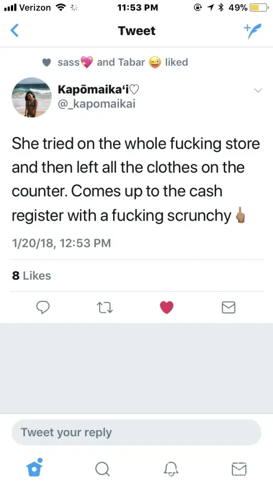 Hello, I am a frequent shopper at pacsun in Kaneohe, Oahu and I wanted to make a complaint about an employee. Her name is Kapōmaika'i and I everytime I shop around the store it feels unfriendly when she is around. I also came across a twitter post of hers and it was negative talk about a customer. I felt offended because sometimes I do what that customer did and it makes me feel uncomfortable knowing that if I did that again, she would post something about it. I have screenshots and evidence and pictures of what she looks like. Thank you.