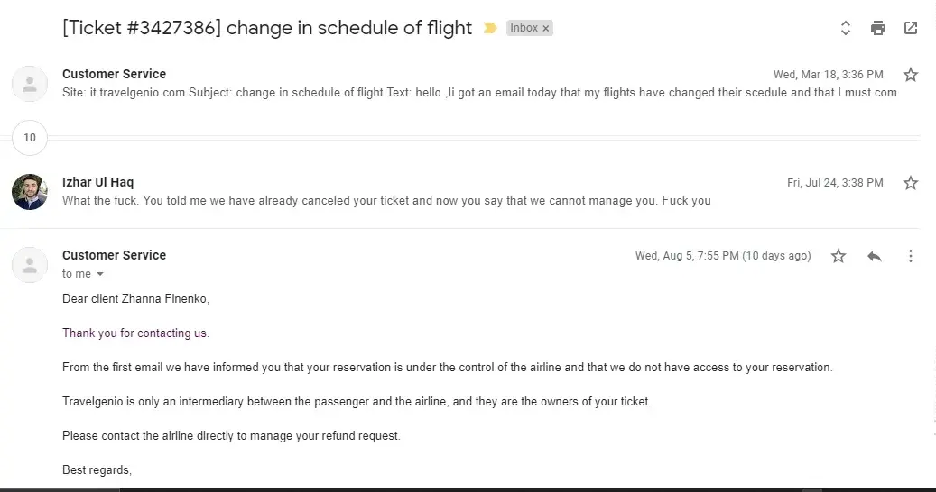 However, a very kind lady answered and assisted me. She told me that all emails sent go straight into the Junk mail, and are not checked (very strange). I gave her my booking reference; she said I should write by post, with all my concerns and copies of tickets.