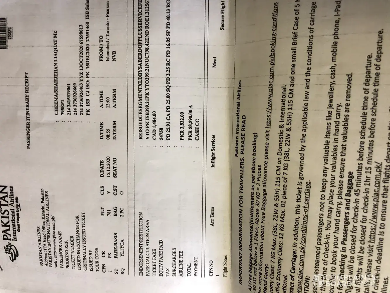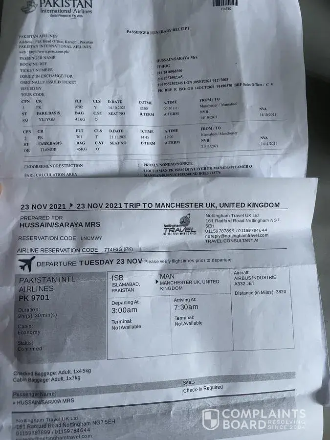 I booked 3 adults tickets through an agent to travel to Pakistan direct to Sialkot on the 10th December 2019.
