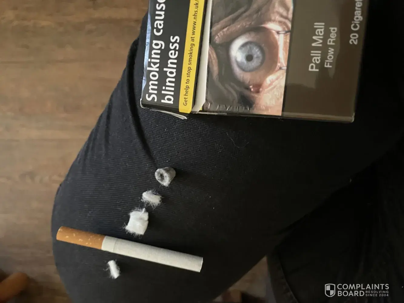 So my mum bought some cigarettes and i had one that was in my pocket and broke so i decided to roll it in rizla. As i pulled the tobacco from the label at the end, tiny black stones fell out and on closer inspection the filter was made with them in. However only half of the filter had them. It was like the half of the filter with stones in them was hidden and they had put half a normal filter in the bunning end so it looked normal. Buy stones i mean very tiny shards of some black stone. The conclusion iv come to thats probably the most reasonable is that the company/person that made these have done it for weight purposes, so the ### seems like it has more tobbaco than it actually has. I have pictures but my camera is not the best. If anyone knows how i can complain let me know.