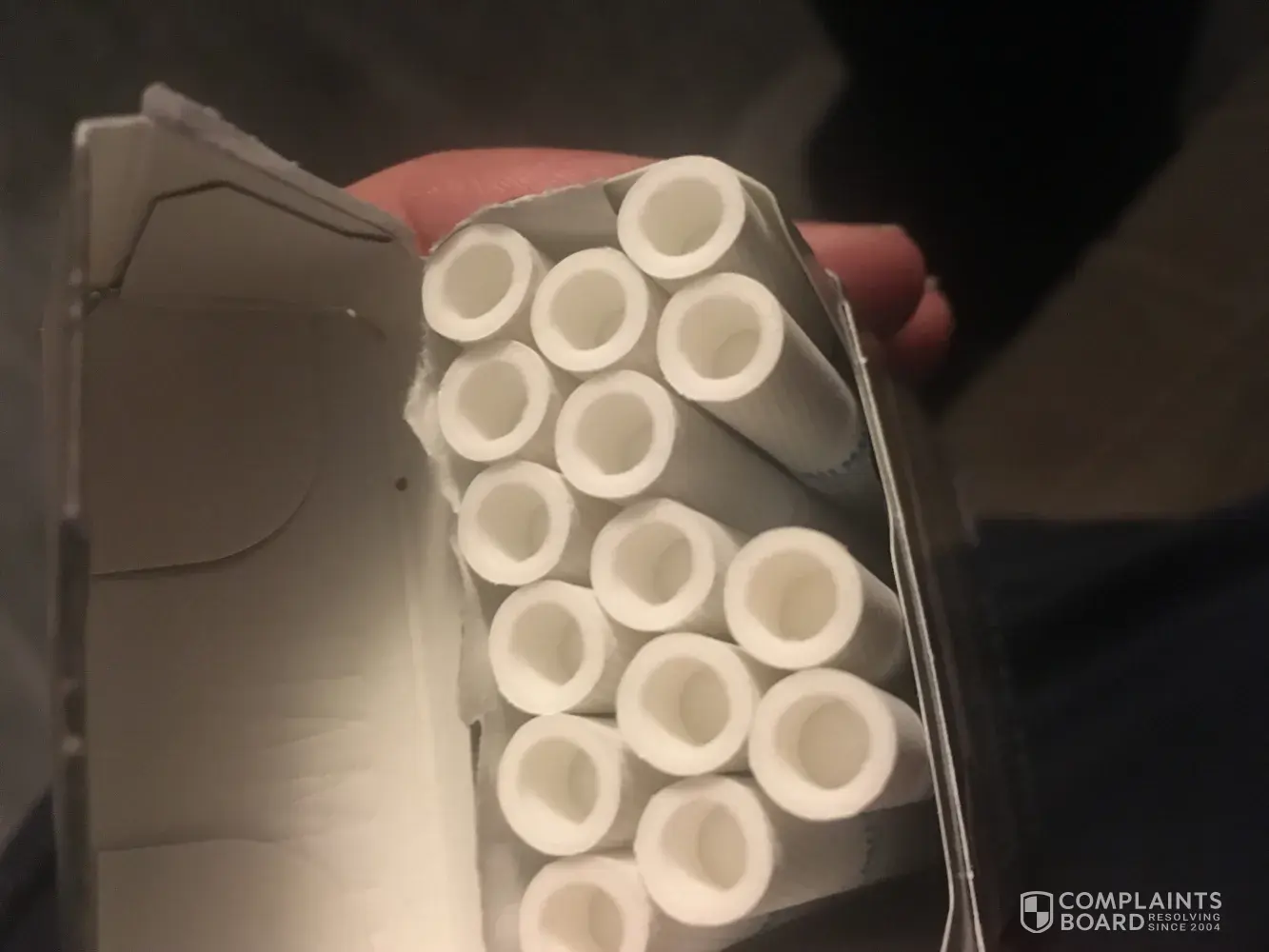 The butts of my cigarettes were hollow. I have purchased this brand of cigarettes for many years and never had this problem. I have purchased this exact brand of cigarettes from this shell gas station for several years now. I have never experienced this before in my life. I am wondering why this has happened because this has never happened to me before.