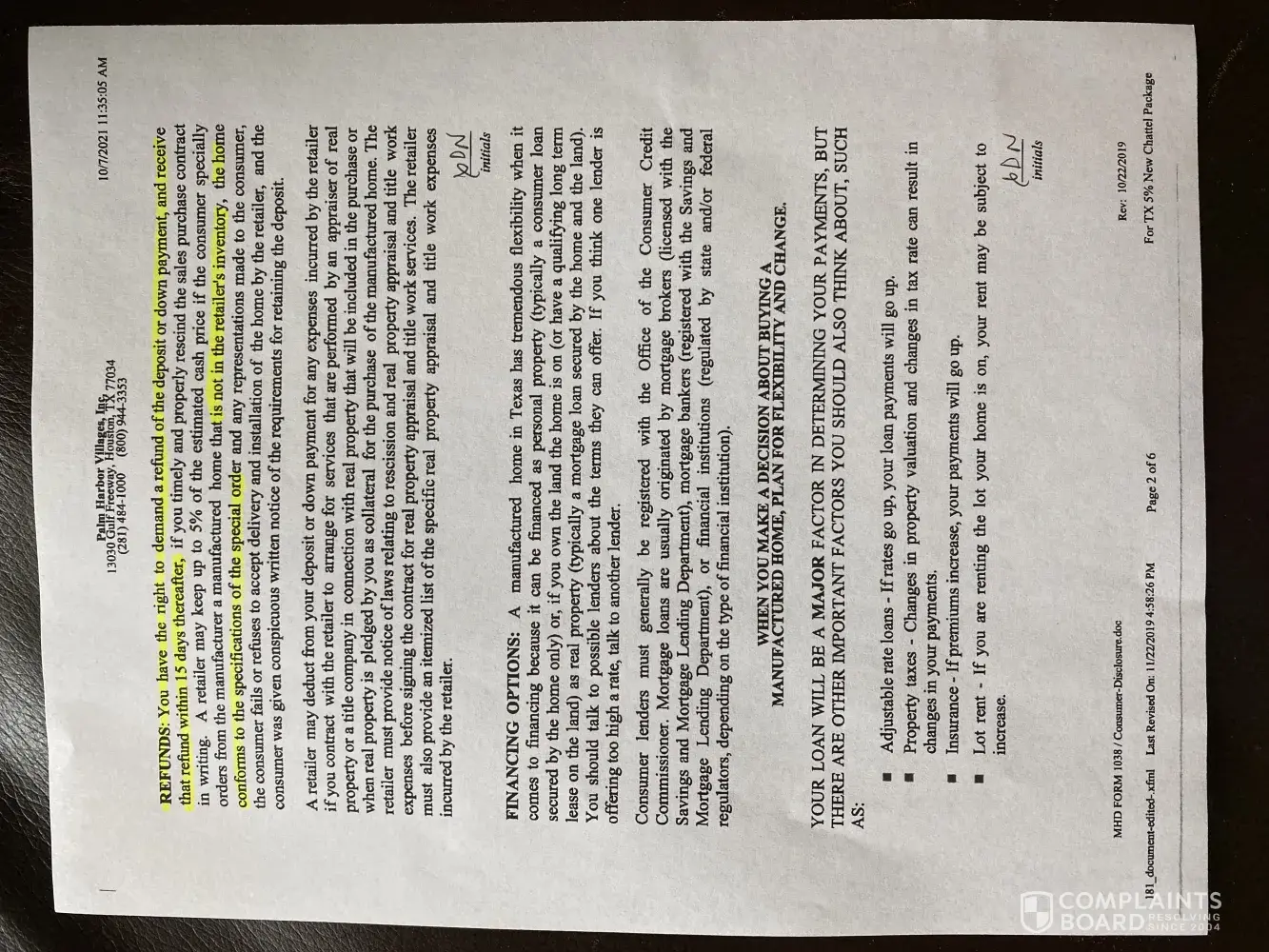 They also did not install the new tandem septic system and said they would refund $8000+ for the incomplete work. We were told by the general manager in Round Rock that the check was received by our mortgage company and he lied because they have no records of a check from Palm Harbor nor any phone calls in the records. It is now almost 22 months since I closed, I have no new septic (cancelled the request 6 months ago) and still have not received my money back. Only lies and delays.