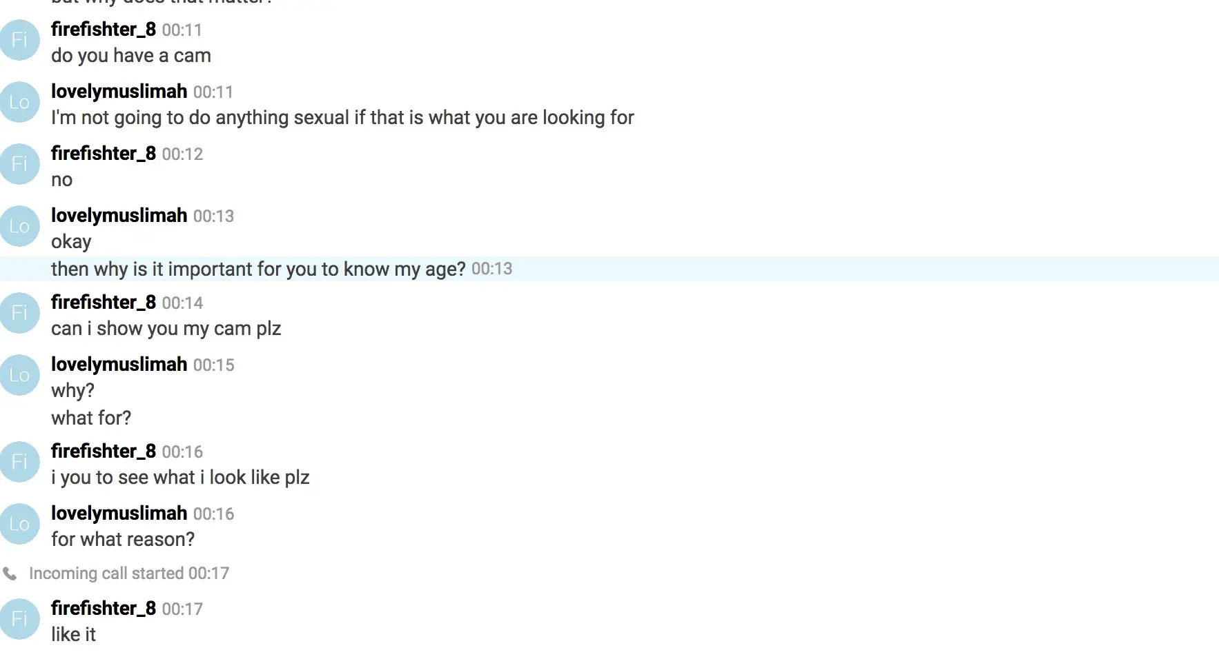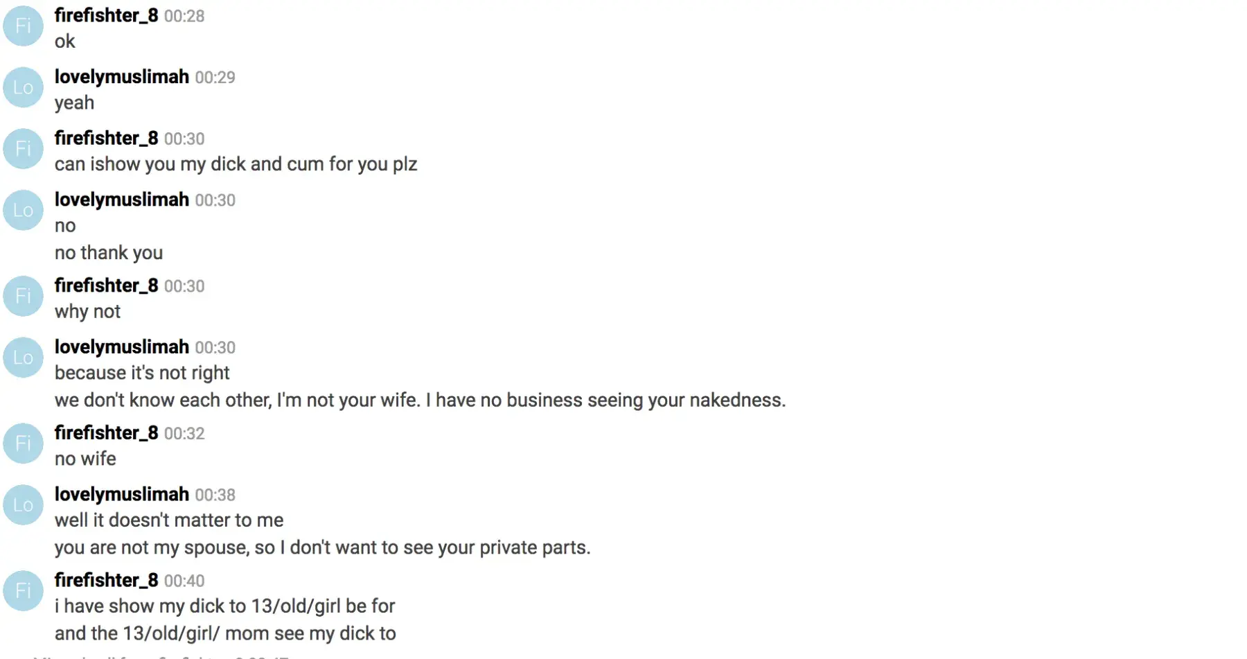 On November 4, 2019, at about 12:30 am a user of paltalk that has the nickname firefishter_8 has exposed himself on a video call after I had said no to doing any sexual activities with him. He had asked for my age and gender. Then he asked if I had a camera, when he asked that I got suspicious and I knew he might have wanted to do something sexual. So I told him in advance that I didn't want to do anything sexual. He then called me and turned on his camera while being nude and he was masturbating. I ended the call and he proceeded to ask me if he could show me himself making himself orgasm. I rejected his offer and he told me that he looks for females to expose himself to. He also confessed to exposing himself to a minor, a 13-year-old female.