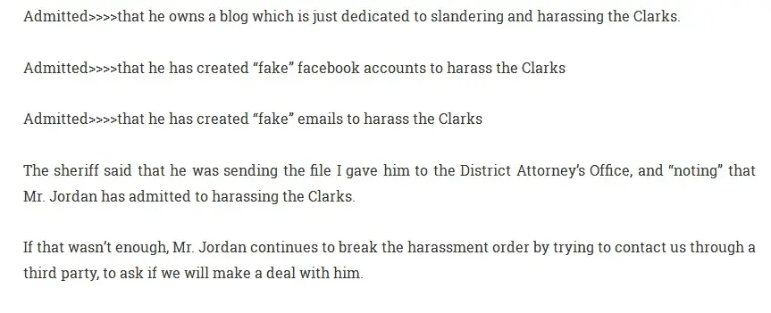 So now fast-ward for the facts of Mr. Jordan’s admitted harassing the Clarks……