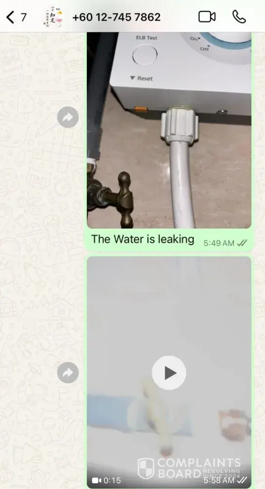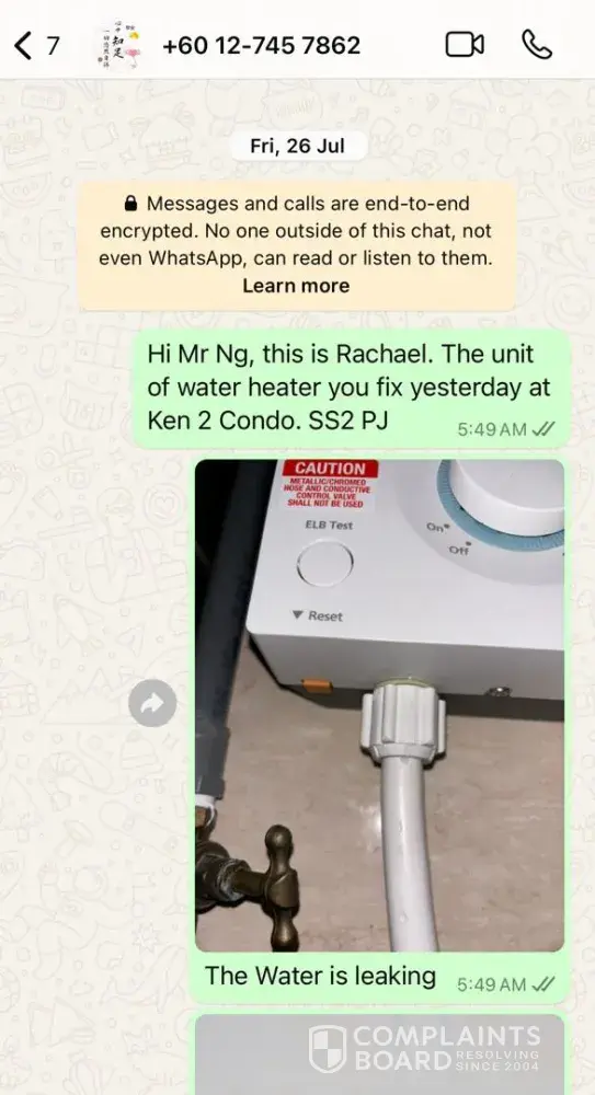 I am writing to address the ongoing issue with my Panasonic water heater, as highlighted in my previous complaints and service visits. Despite the efforts made by Mr. Ng Chong Ling on July 25th and subsequent follow-up communications, the water heater continues to malfunction, with persistent water leakage from the unit's interior.